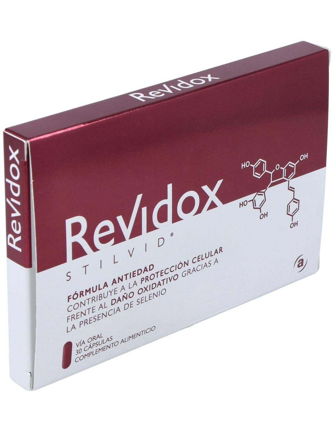 Revidox es un complemento alimenticio que posee una fórmula antiedad desarrollada para la protección celular gracias a la presencia de Selenio y compuesta además por un concentrado de activos de origen natural, como las Antocianinas de Uva, el Resveratrol y el Extracto de Granada.Es importante reforzar nuestras propias barreras antioxidantes, y una de las formas más efectivas de hacerlo es llevando una dieta sana y equilibrada rica en sustancias antioxidantes.Entre los activos de Revidox destaca el resveratrol con reconocidas propiedades antioxidantes y cardiosaludables que contribuye a proteger y mejorar nuestra salud celular. Contiene otros ingredientes como Extractos de Uva y Granada, además de Selenio, un mineral esencial que protege del daño oxidativo.Composición activa por cápsula: