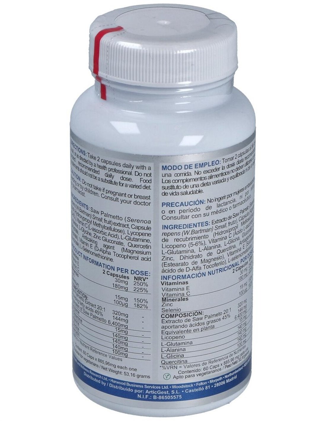 Saw palmetto, Serenoa repens, Sabal serrulata o simplemente sabal son los diferentes nombres con los que se conoce a esta pequeña palmera originaria de Norteamérica y que hoy en día es uno de los complementos más habituales en Europa y Estados Unidos. Las dos cápsulas diarias recomendadas Saw Palmeto Complex aportan 320 mg de extracto concentrado de saw palmetto de máxima calidad, equivalente a 6.400 mg de la planta. Saw Palmeto Complex incluye además niveles significativos de otros nutrientes importantes que potencian el efecto del sabal como licopeno y los aminoácidos L-alanina, L-glicina y L-glutamina o el flavonoide quercitina. Completan esta fórmula única y exclusiva la vitamina C, E y el selenio que contribuyen a la protección de las células frente al estrés oxidativo y el zinc que contribuye al mantenimiento de niveles normales de testosterona en sangre. Ingredientes activos por dosis diaria (2 cápsulas):