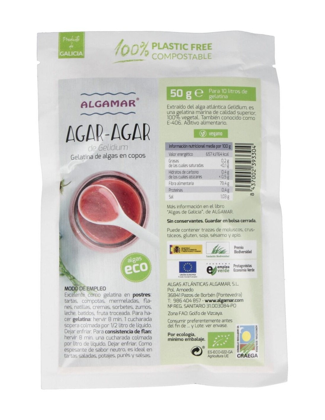 ALGAMAREl Agar-Agar en Copos de Algamar es un gelificante natural para cocineros y reposteros que buscan una alternativa vegetal a la gelatina, elaborado a partir de algas marinas para aportar textura y consistencia en sus preparaciones.