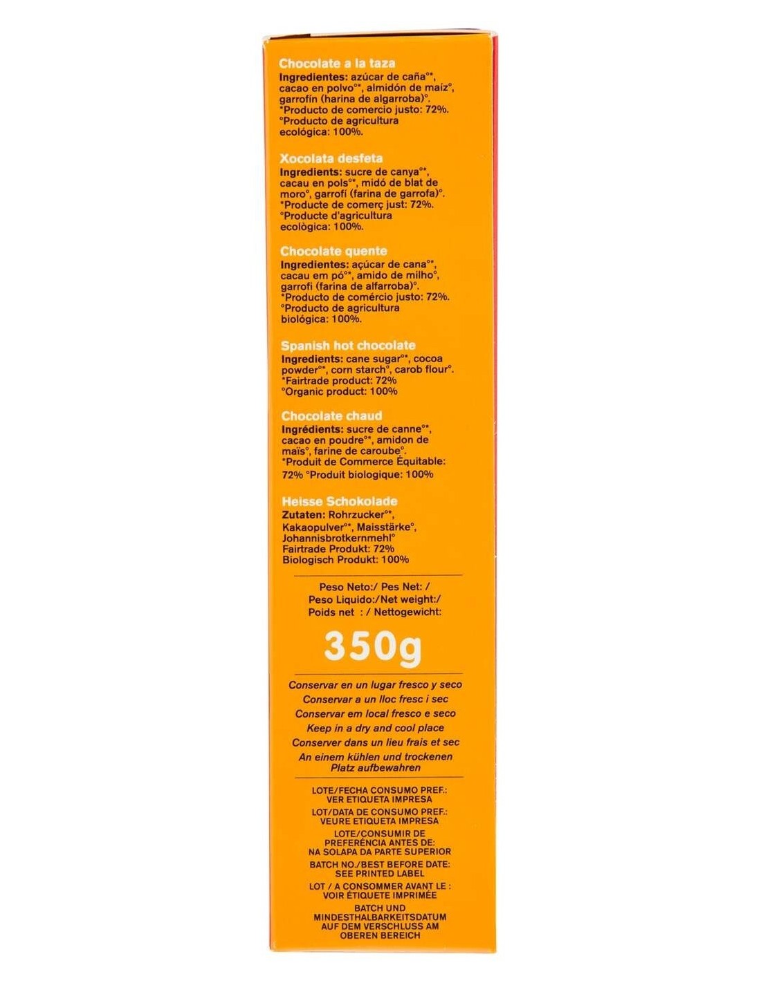 ALTERNATIVAChocolate a la taza en polvo en paquete de 350gr de peso. Incluye azúcar de caña natural de Paraguay y cacao desgrasado de República Dominicana.
