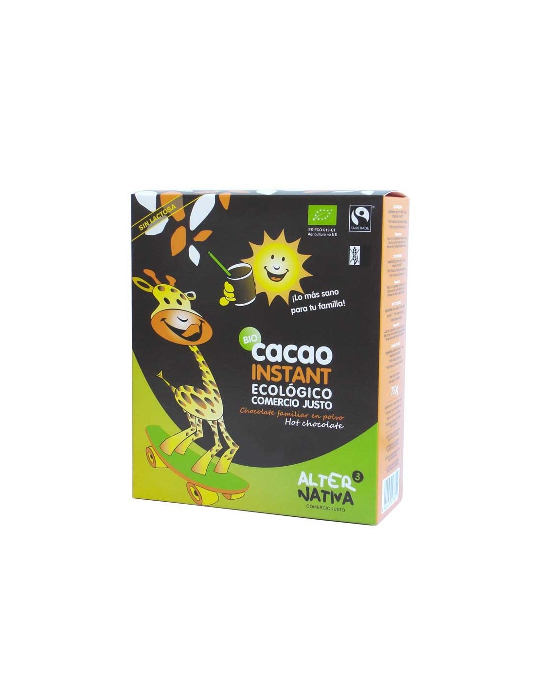 ALTERNATIVA3CACAO INSTANTANEO BIO 750G ALTERNATIVA3Exquisito cacao instantáneo ecológico. Sus ingredientes han sido cultivados en armonía con la Naturaleza, utilizando técnicas tradicionales, sin agroquímicos. De disolución inmediata tanto en leche fría como caliente.Cacao de variedad Criollo. El Criollo es la variedad de cacao más apreciada por su calidad, aroma y sabor. Se trata de un cacao muy aromático y menos amargo que el Forastero, que es la variedad más abundante.Se calcula que el cacao Criollo representa menos de un 3% de la producción mundial de cacao, debido a que la planta es muy delicada, y menos productiva que otras variedades.Sin lactosa ni gluten.Ingredientes:Azúcar de caña*, cacao desgrasado en polvo.**Procedente de Agricultura ecológica y Comercio Justo(Min. 35% Cacao Puro desgrasado.)Procedencia:Cacao de República Dominicana/Perú y Azúcar de ParaguayInformacion nutricional:Valor energético359kcalGrasas2,7 gCarbohidratos:75,2 gProteinas5,2 gSobre Alternativa 3:Alternativa 3, importa, elabora y distribuye productos ecológicos de comercio justo que han sido producidos respetando los derechos humanos, el medio ambiente y la justicia social.Miembro de WFTO (World Fair Trade Organization).Miembro de CECJ (Coordinadora Estatal de Comercio Justo).