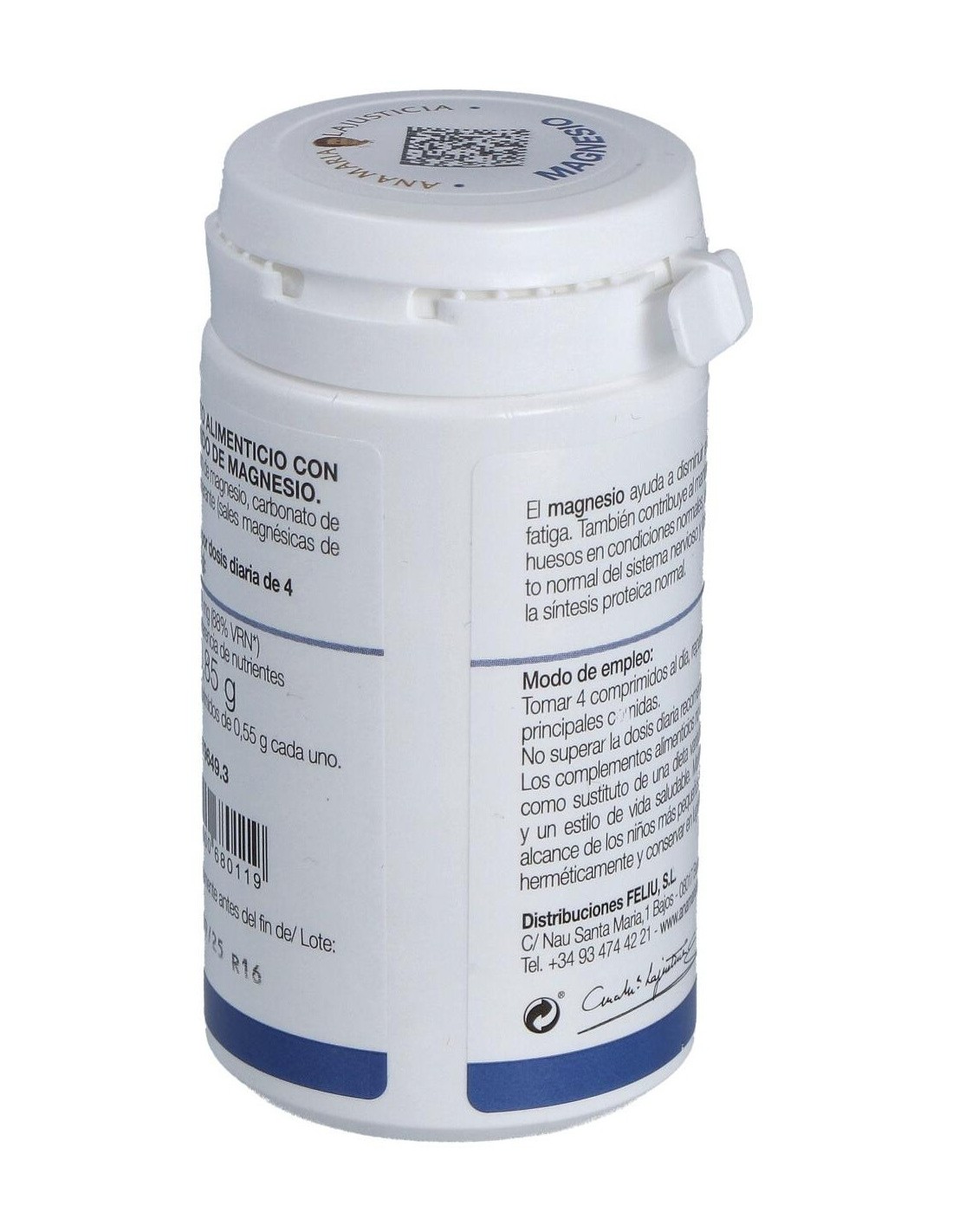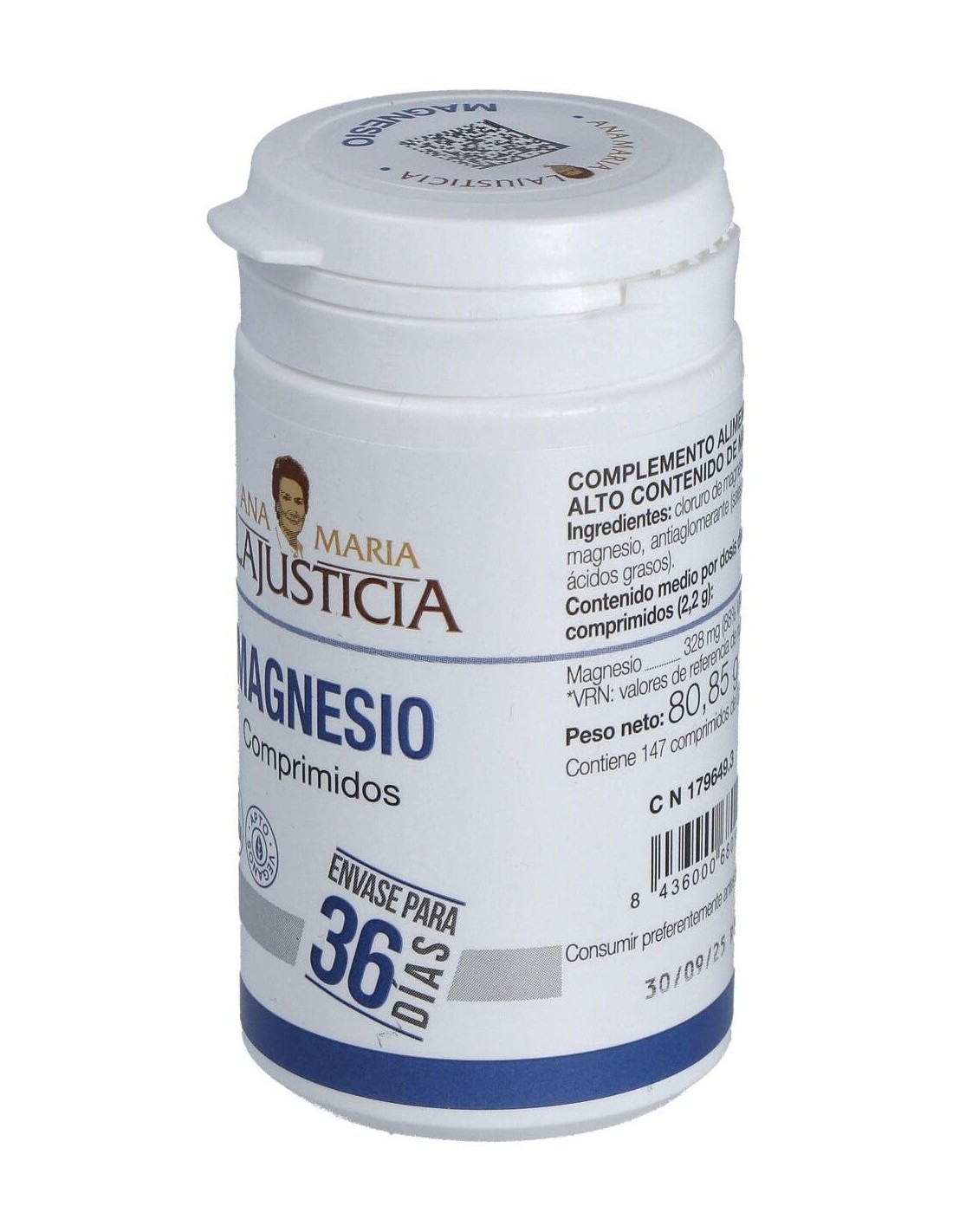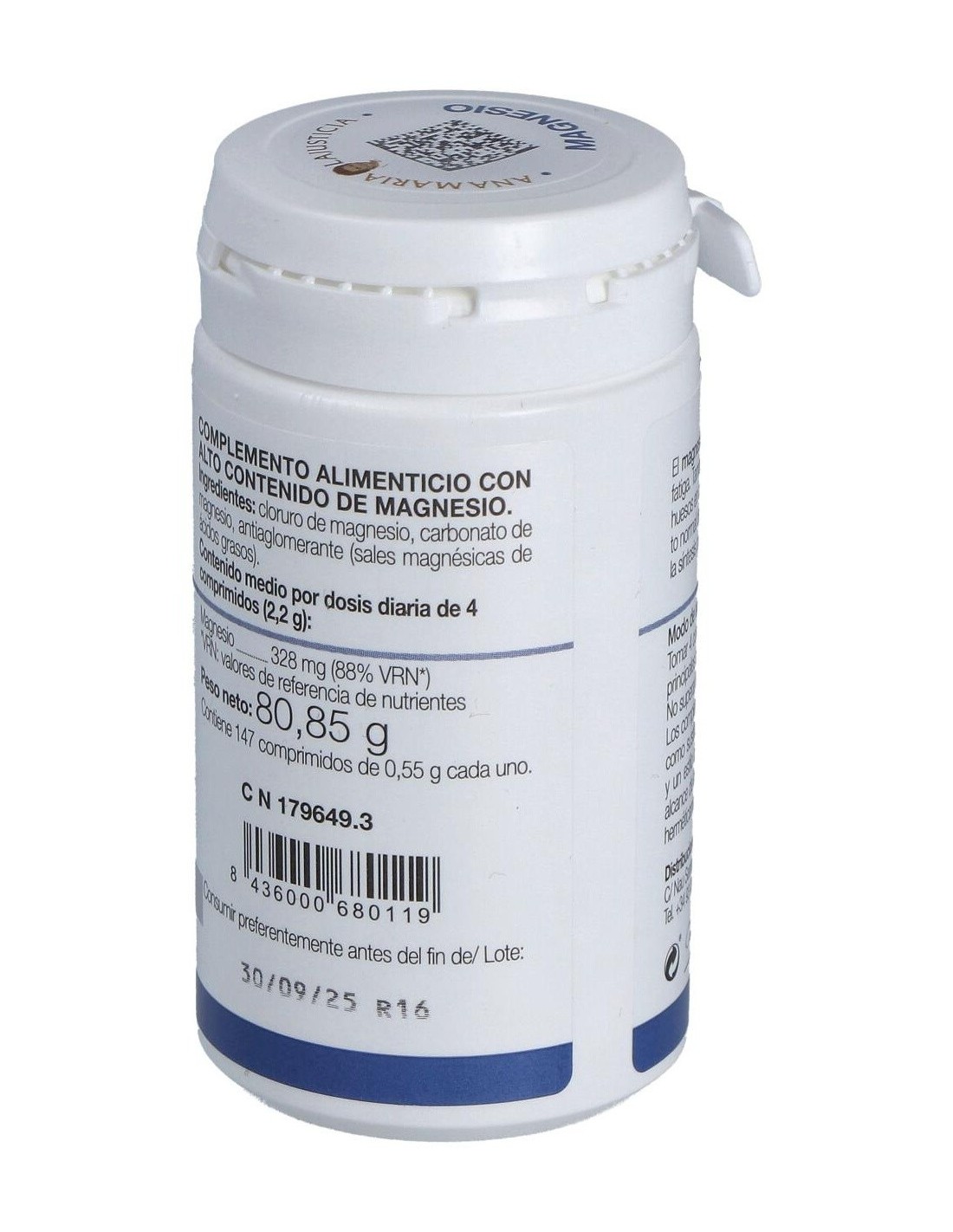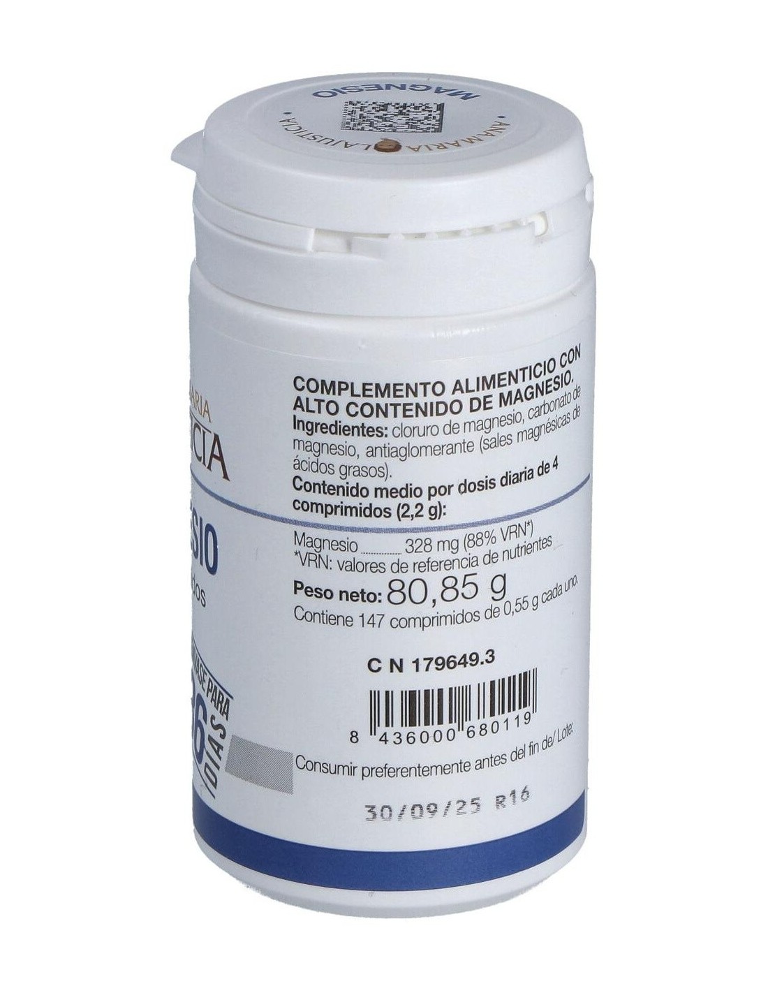 Composición por comprimido:71 mg de ión magnesio (cloruro de magnesio hexahidratado y carbonato de magnesio).Modo de empleo:Tomar 5 comprimidos al día con las comidas.Presentación:Bote de 147 comprimidos.