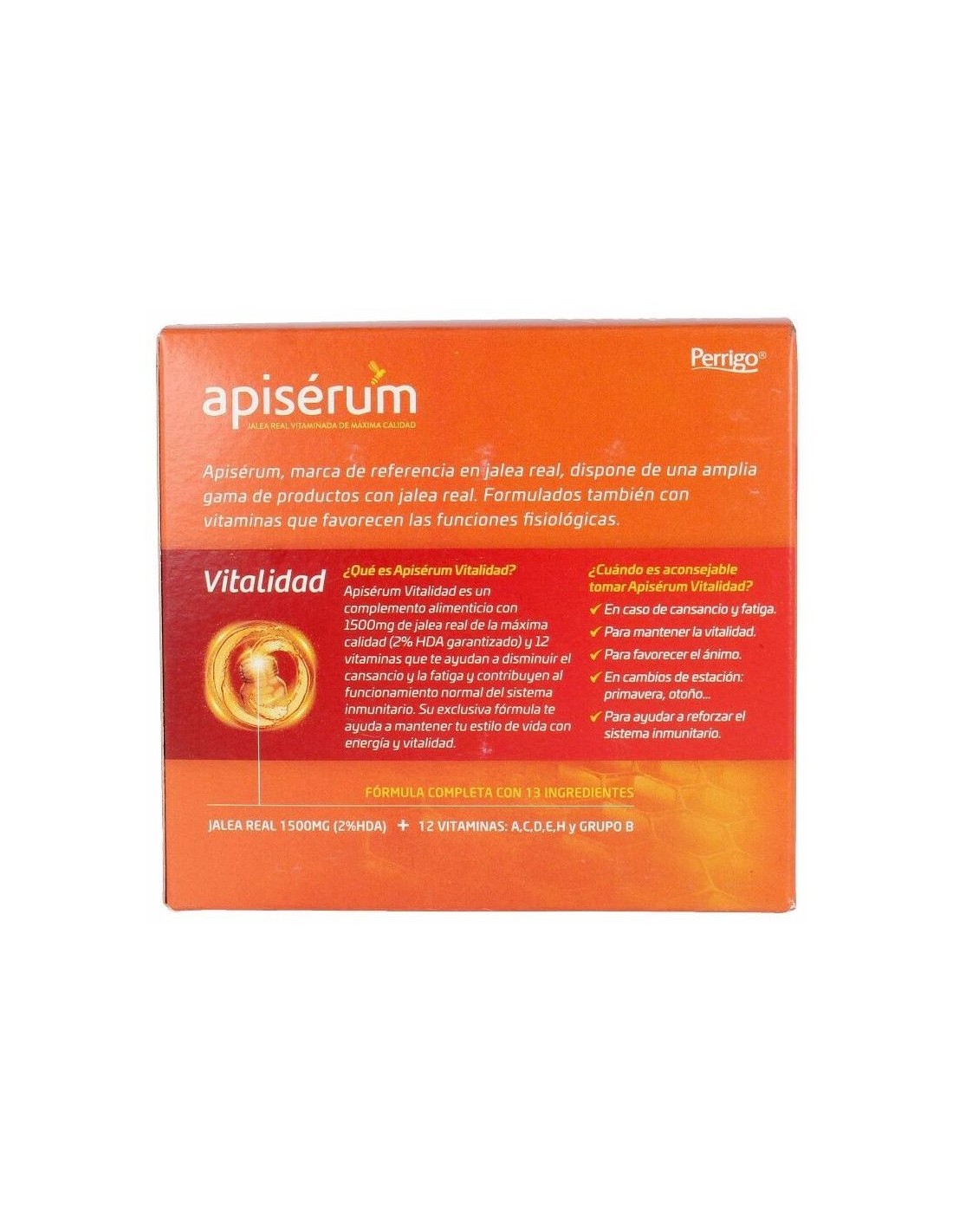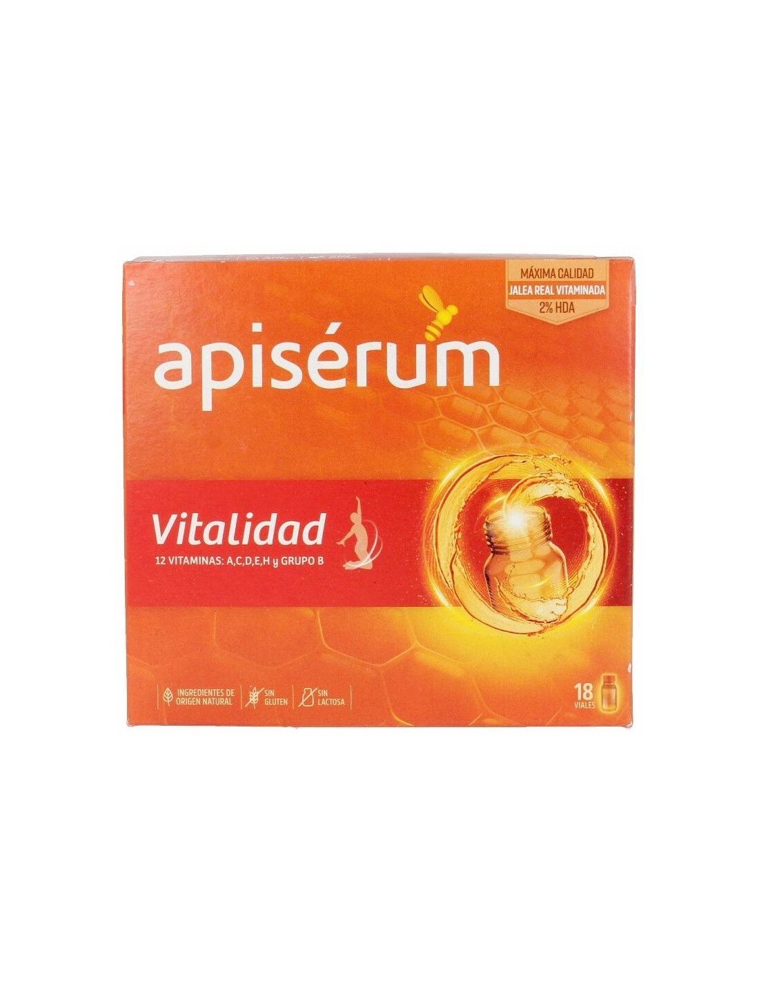 APISERUMApiserum | Apiserum Vitalidad 18 VialesApiserum Vitalidad 18 Viales es un complemento alimenticio en base de Jalea Real de la máxima calidad y 12 vitaminas que te ayudan a disminuir el cansancio y la fatiga y contribuyen al funcionamiento normal del sistema inmunitario. Su exclusiva fórmula te ayuda a mantener tu estilo de vida con energía y vitalidad.