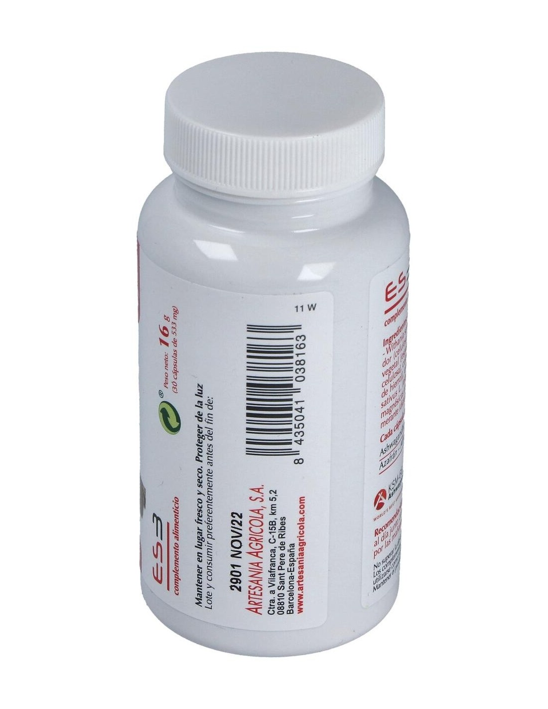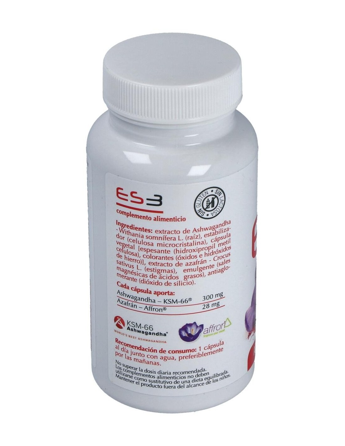 Ingredientes:Extracto de Ashwagandha - Withania somnífera L. (raíz), estabilizador (celulosa microcristalina), cápsula vegetal [espesante (hidroxipropil metil celulosa), colorantes (óxidos e hidróxidos de hierro)], extracto de azafrán - Crocus sativus L. (estigmas), emulgente (sales magnésicas de ácidos grasos), antiaglomerante (dióxido de silicio).Modo de empleo:Tomar 1 cápsula al día junto con agua, preferiblemente por las mañanas.Presentación:Envase de 30 cápsulas.