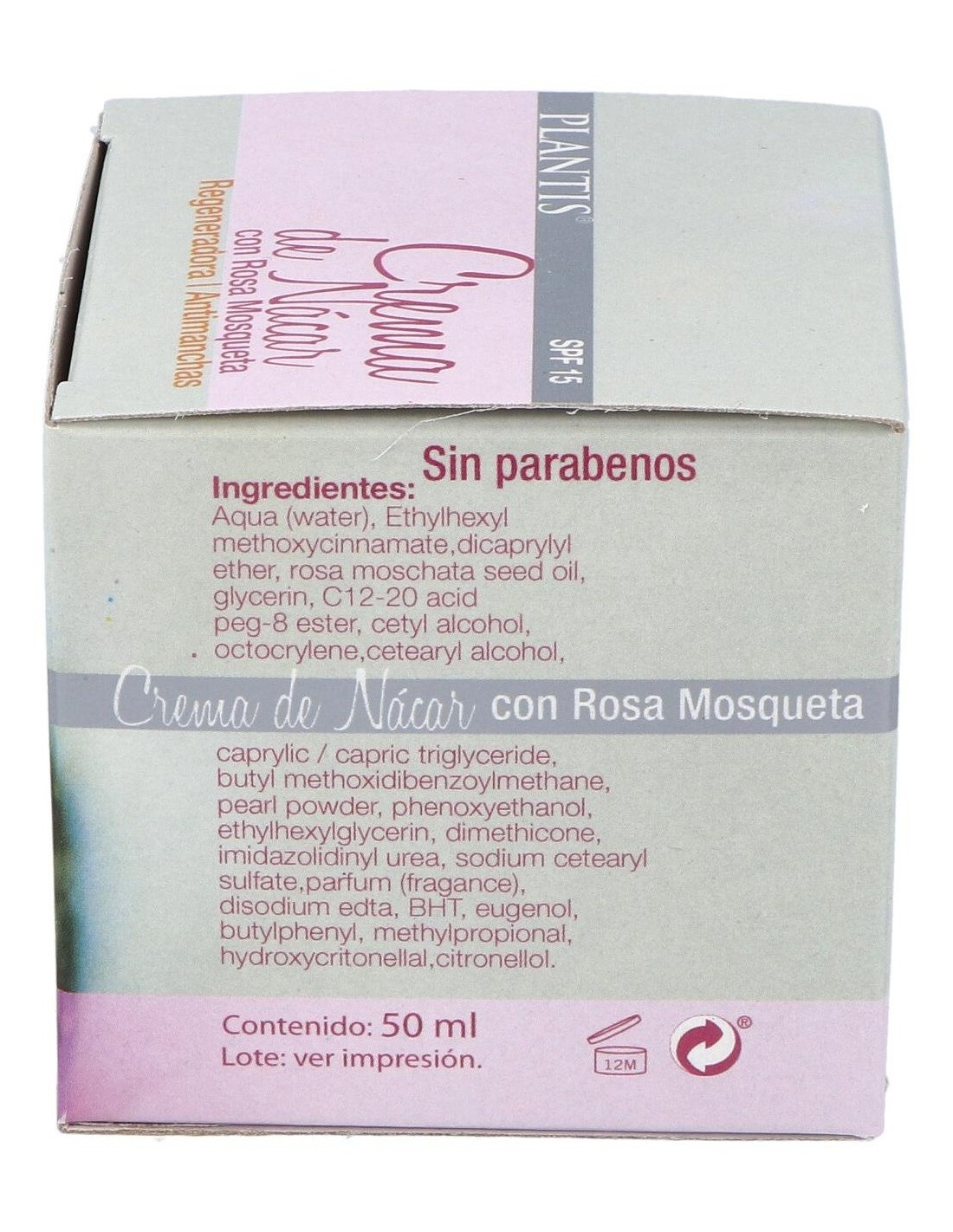 La crema de Nácar Plantis a base de nácar de perlas salvajes y aceite de rosa mosqueta es ideal para el tratamiento de pieles dañadas y decoloradas.Sus ingredientes son regenerantes y permiten una reparación de la piel que vuelve a recuperar su tonalidad y elasticidad. El polvo de perla Nácar se considera un biomineral con propiedades regenerantes, protectoras y nutritivas de la piel, su uso continuado mantiene un tono de piel uniforme y cierra los poros.El aceite de Rosa mosqueta contiene un alto porcentaje de ácidos grasos esenciales poliinsaturados que consiguen mejorar la función protectora de la epidermis.Ingredientes (INICI):Aqua, Ethylhexyl Methoxycinnamate, Dicaprylyl Ether, Glycerin, C12-20 Acid Peg-8 Ester, Rosa Moschata Seed Oil, Cetyl Alcohol, Octocrylene, Cetearyl Alcohol, Butyl Methoxydibenzoylmethane, Caprylic/Capric Triglyceride, Pearl Powder, Phenoxyethanol, Dimethicone, Imidazolidinyl Urea, Lactic Acid, Sodium Cetearyl Sulfate, Disodium Edta, Parfum, Bht, Ethylhexylglycerin, Geraniol, Hydroxycitronellal, Citronellol, Disodium Phosphate, Tocopherol, Potassium Phosphate, Eugenol.Modo de empleo:Aplicar una pequeña cantidad de crema y masajear hasta su completa absorción.Presentación:Envase de 50 ml.