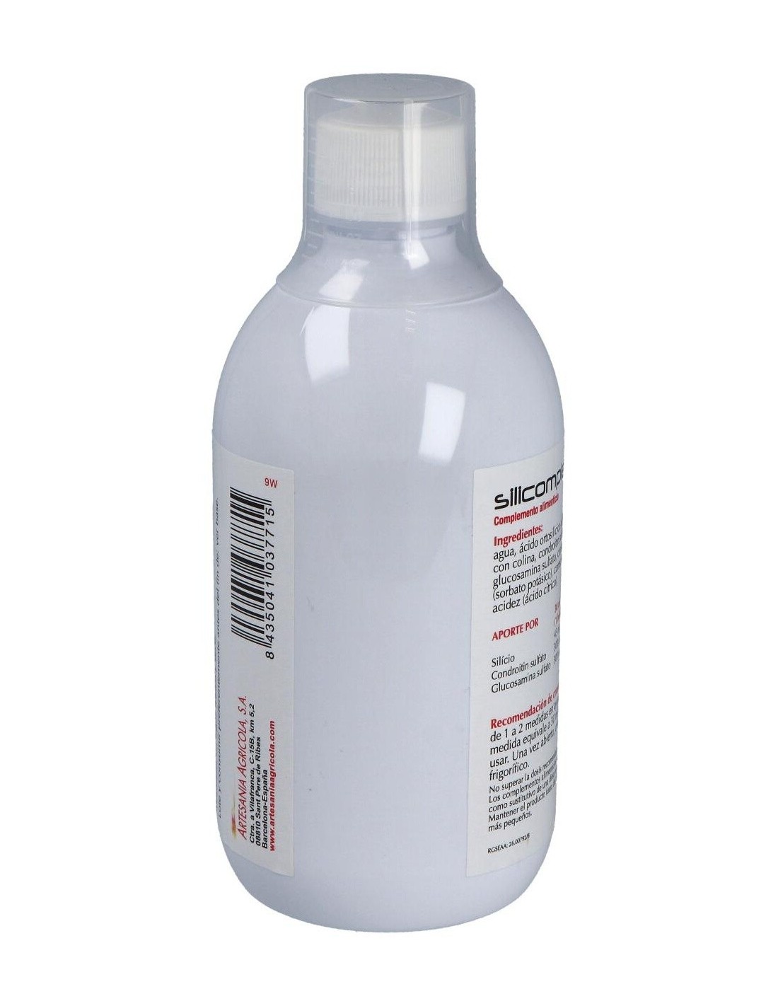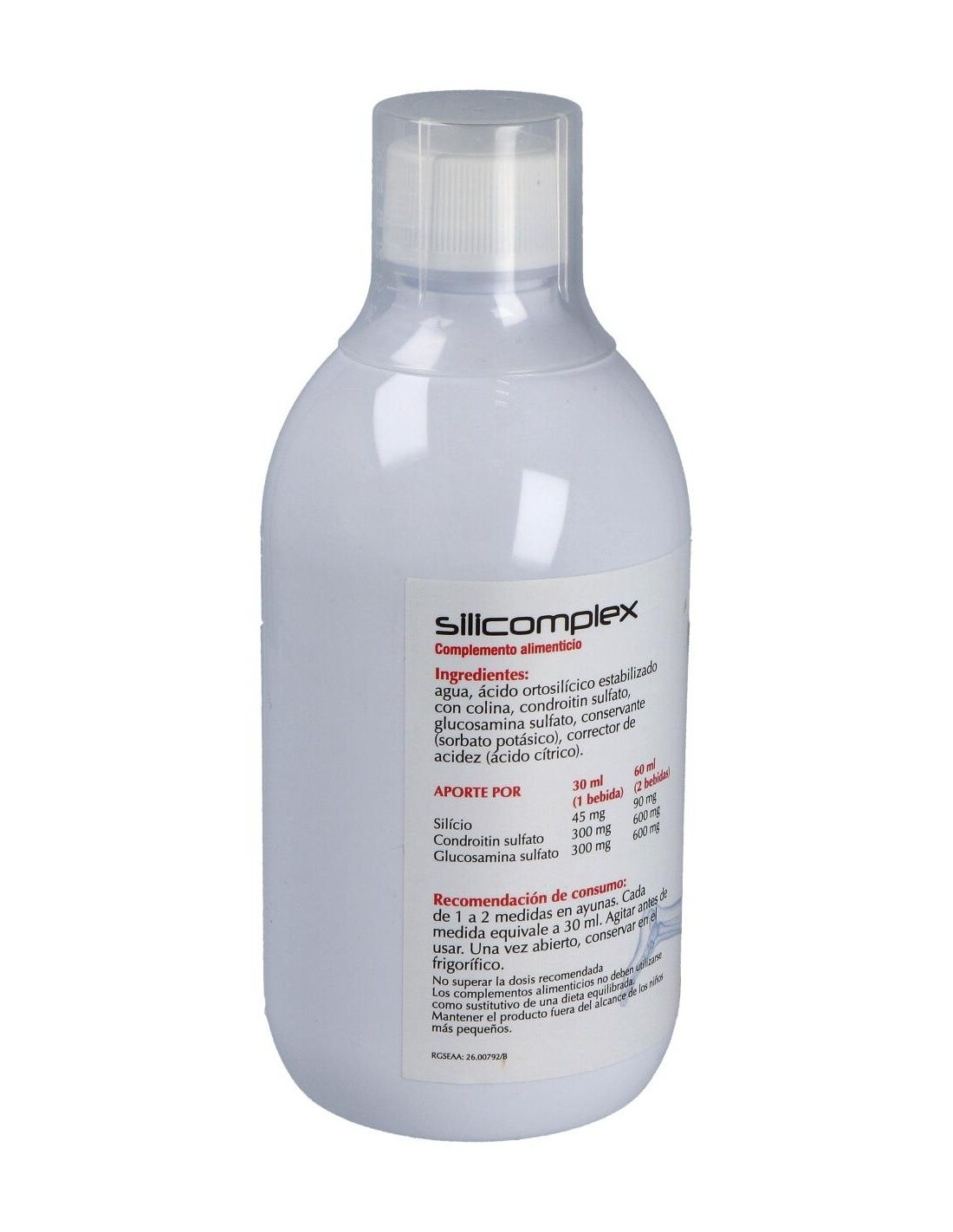 Ingredientes:Agua, ácido ortosilícico estabilizado con colina, condroitin sulfato, glucosamina sulfato, conservante (sorbato potasico), corrector de acidez (ácido cítrico).Modo de empleo:Tomar de 1 a 2 medidas 20 minutos en ayunas, antes de desayunar. Cada medida equivale a 30 ml.?Una vez abierto conservar en frigorífico.Presentación:Envase de 500 ml.
