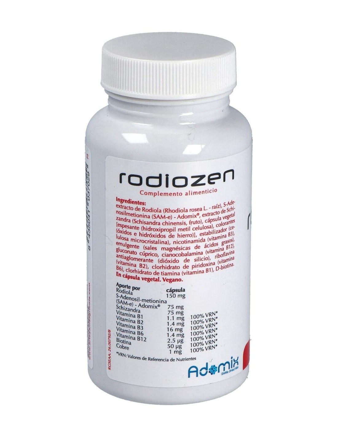 Ingredientes:Extracto de Rodiola (Rhodiola rosea L. - raíz), S-Adenosil-metionina (SAM- e) - Adomix®, extracto de Shizandra (Shisandra chinensis, fruto), cápsula vegetal [espesante (hidroxipropil metil celulosa), colorantes (óxidos e hidróxidos de hierro)], estabilizador (celulosa microcristalina), nicotinamida (vitamina B3), emulgente (sales magnésicas de ácidos grasos), gluconato cúprico, cianocobalamina (vitamina B12), antiaglomerante (dióxido de silicio), riboflavina (vitamina B2), clorhidrato de piridoxina (vitamina B6), clorhidrato de tiamina (vitamina B1), D-biotina.cModo de empleo:Tomar 1 cápsula al día junto con agua, preferiblemente entre comidas.Presentación:Envase de 60 cápsulas.