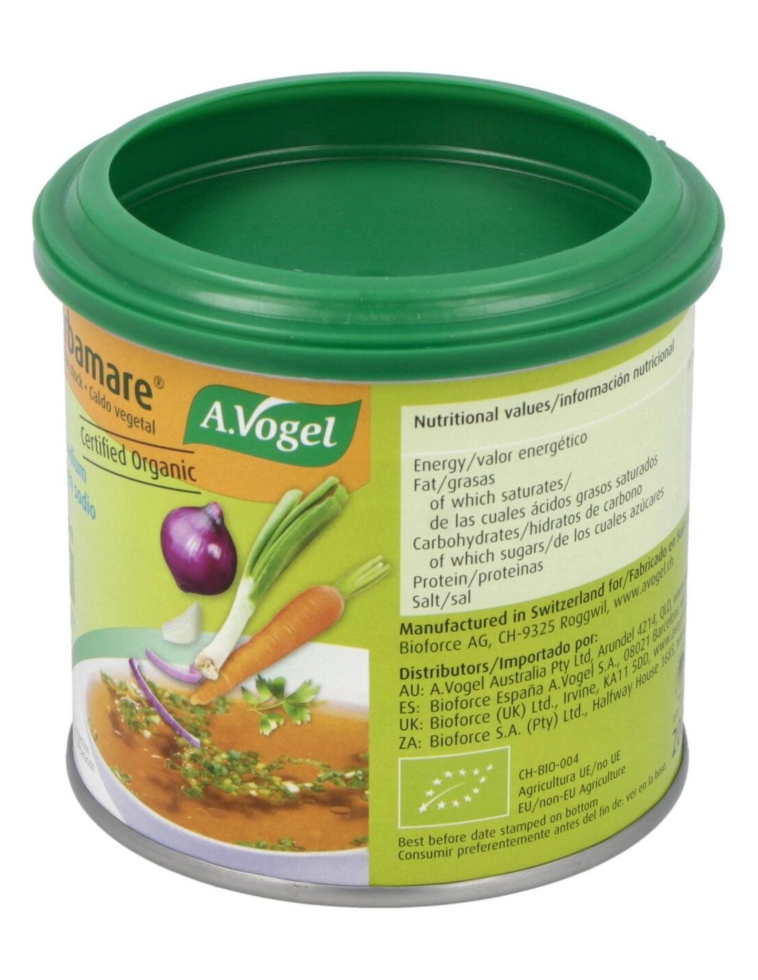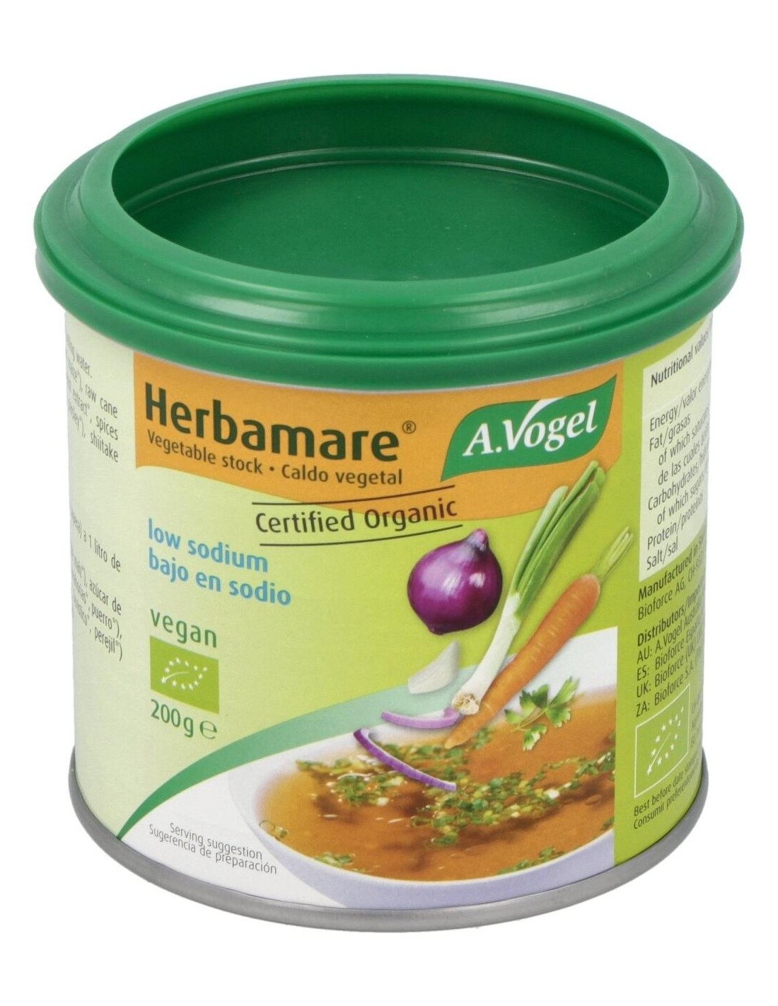Herbamare Caldo Vegetal Bajo En Sodio Bote 200 Gr de A.Vogel ofrece una alternativa para quienes buscan un caldo vegetal con menor contenido de sodio, manteniendo un sabor equilibrado y versátil para diversas preparaciones culinarias.