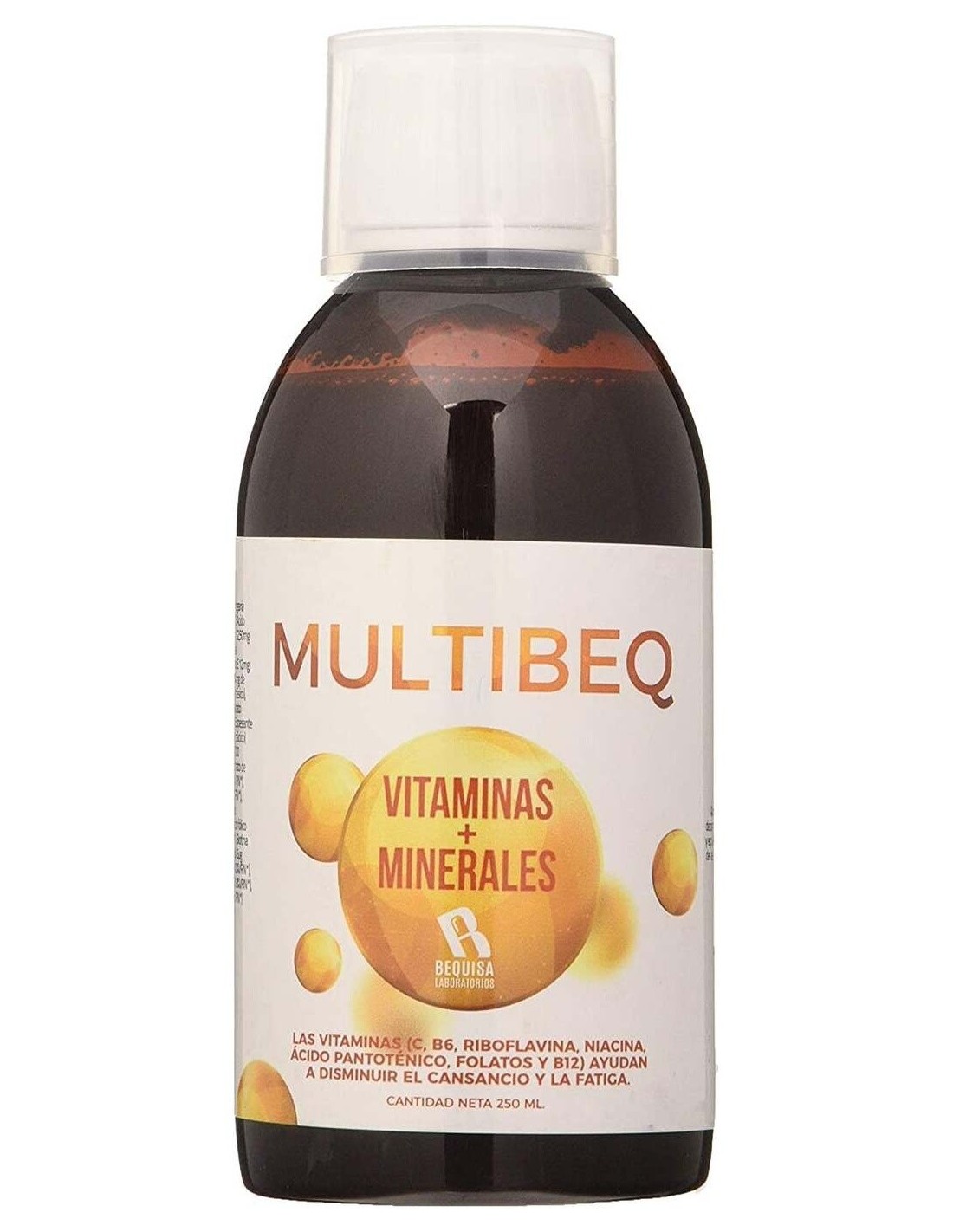 Multibeq de Bequisa es un complemento alimenticio contiene vitaminas y minerales necesarios para mantener el estado natural y el buen funcionamiento del cuerpo en general y para la correcta absorción de los nutrientes.Ingredientes por 10 ml:Agua, Fructosa, Zumo concentrado de Fresa (Fragaria x ananassa), Aroma (Aroma de granadina), Vitamina C (Ácido L-ascórbico) 80 mg, Citrato de calcio 32,50 mg (6,825 mg de Calcio), Vitamina E (Acetato de D-alfa-tocoferilo, 50%) 24 mg (Aporte de Vitamina E 12 mg), Citrato de magnesio 21,50 mg (3,354 mg de Magnesio), Conservador (Sorbato potásico), Niacina (Nicotinamida) 16 mg, Fumarato ferroso 11 mg (3,619 mg de Hierro, 25,85%VRN*), Espesante (Goma guar), Ácido pantoténico (D-Pantotenato cálcico) 6 mg, Vitamina A (Acetato de retinilo, 500.000 UI/g) 5,33 mg (800 µg de Vitamina A), Gluconato de manganeso 2,61 mg (0,3 mg de Manganeso), Vitamina B6 (Clorhidrato de piridoxina) 1,40 mg, Vitamina B2 (Riboflavina) 1,40 mg, Tiamina (Clorhidrato de tiamina) 1,10 mg, Ácido fólico (Ácido pteroilmonoglutámico) 200 µg, Biotina (D-Biotina) 50 µg, Vitamina D (Colecalciferol) 5 µg, Vitamina B12 (Cianocobalamina) 2,5 µg, Citrato de zinc 0,0006 mg (0,00186 mg de Zinc), Yoduro de potasio 0,6 µg (0,45 µg de Yodo) y Picolinato de cromo 0,55 µg (0,068 µg de Cromo).Modo de empleo:Tomar 10 ml al día. Puede tomarse directamente o diluido con zumo de frutas.Presentación:Envase de 250 ml.