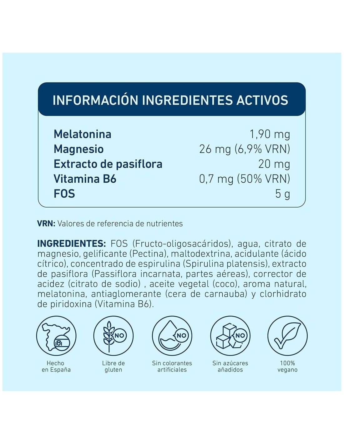 FOS (Fructo-oligosacáridos), agua, citrato de magnesio, gelificante (Pectina), maltodextrina, acidulante (ácido cítrico), concentrado de espirulina (Spirulina platensis), extracto de pasiflora (Passiflora incarnata, partes aéreas), corrector de acidez (citrato de sodio) , aceite vegetal (coco), aroma natural, melatonina, antiaglomerante (cera de carnauba) y clorhidrato de piridoxina (Vitamina B6).