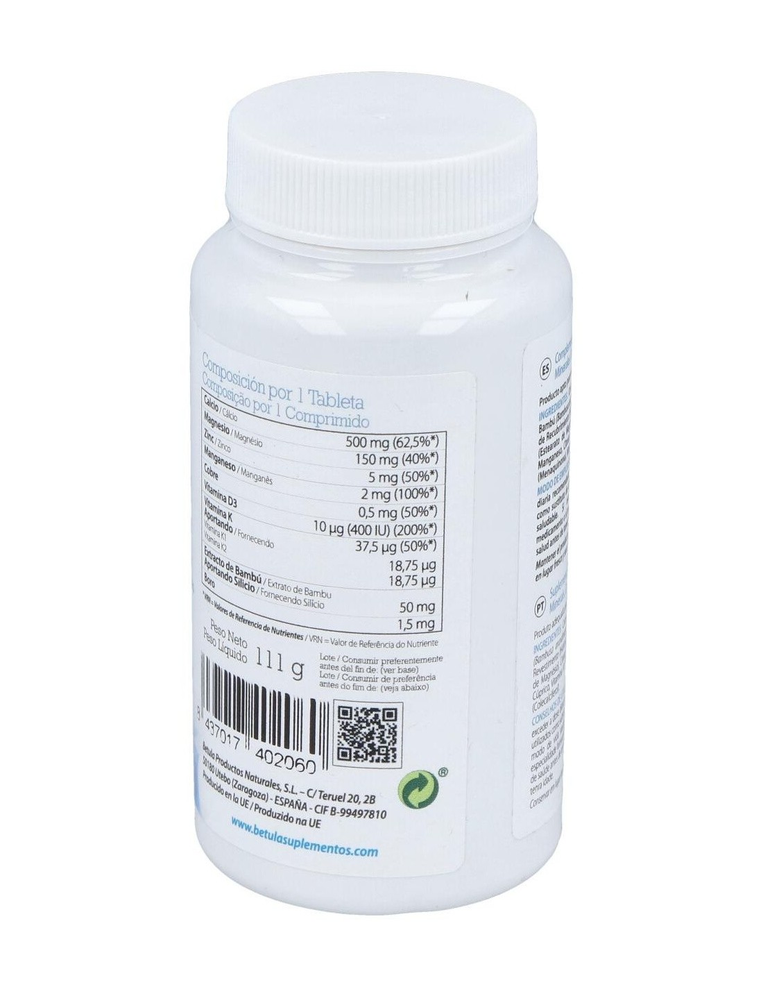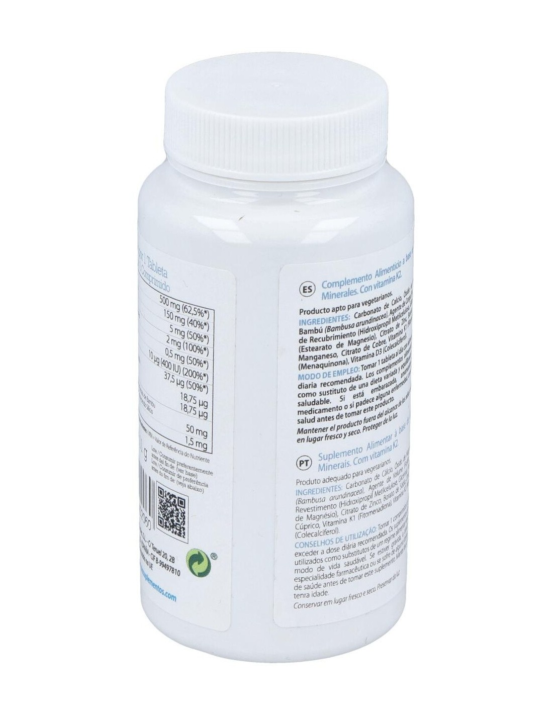 Complemento alimenticio que contiene buenos niveles de calcio, necesario para el mantenimiento de los huesos en condiciones normales. Con vitaminas D y K, magnesio, zinc, manganeso, vitamina K2 (Menaquinona), cobre, boro y silicio. El tejido óseo está en constante renovación y debe su rigidez a los cristales de hidroxiapatita (formados por calcio y otros minerales) y a proteínas como el colágeno.Apto para vegetarianos. Consultar a un médico en caso de embarazo, periodo de lactancia o toma de medicamentos.