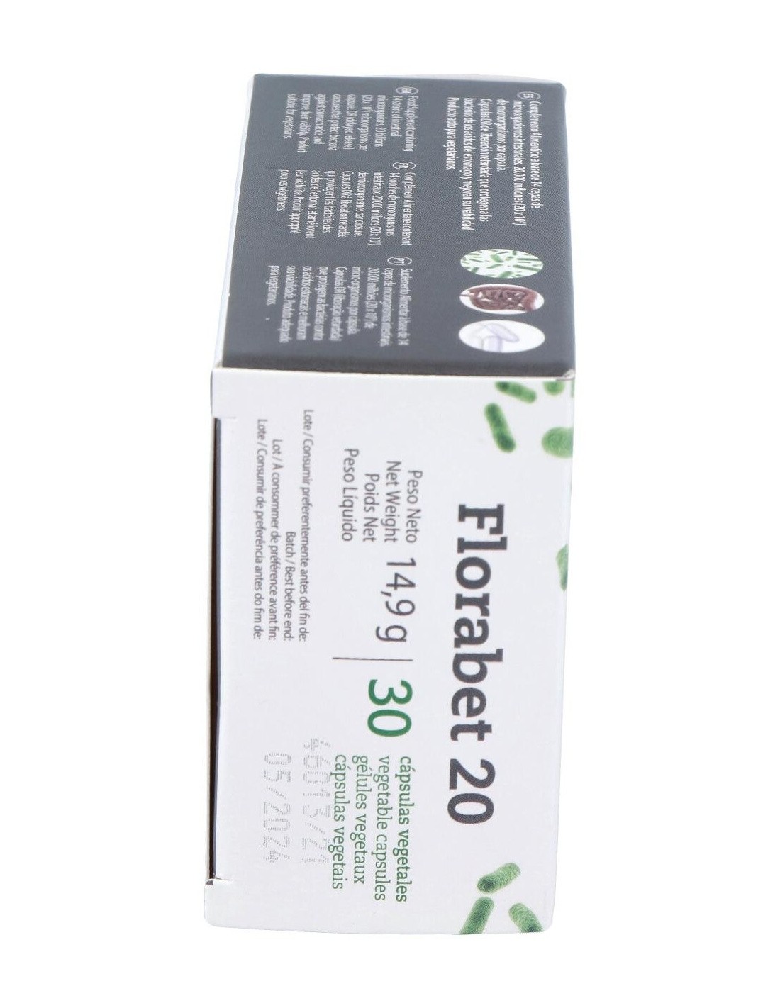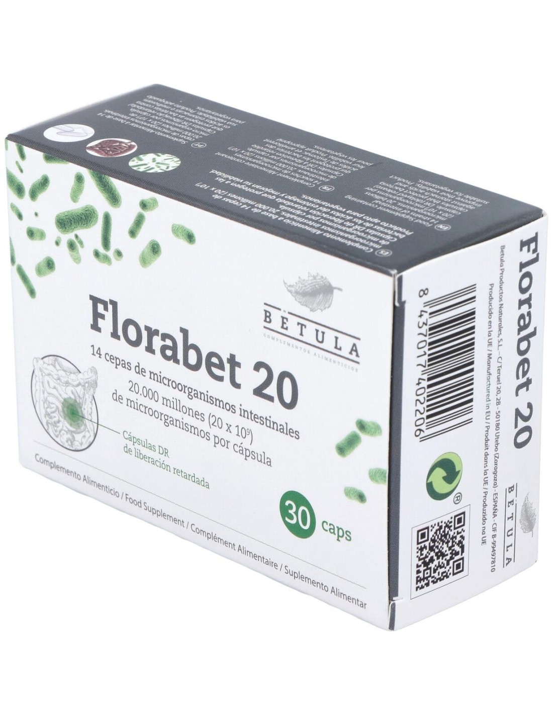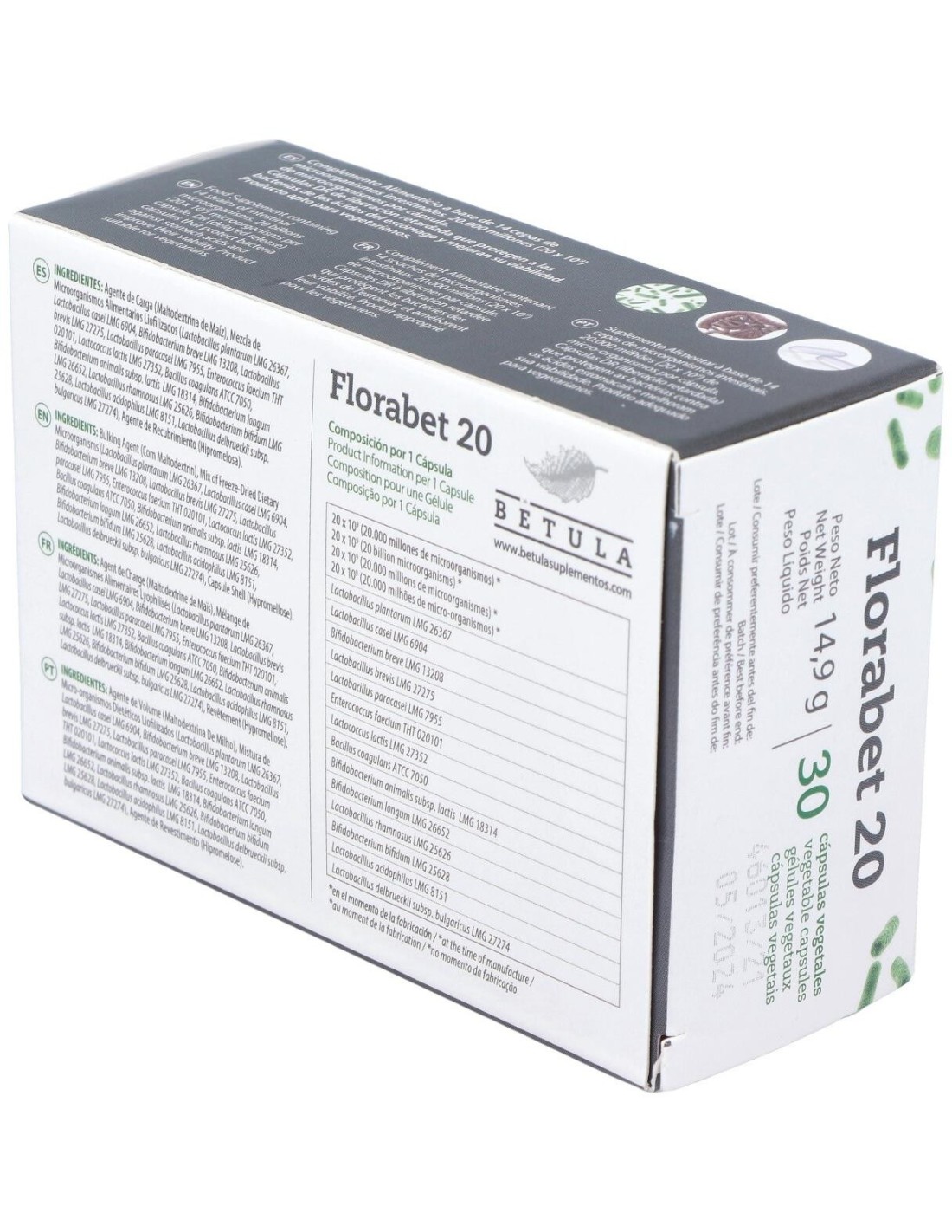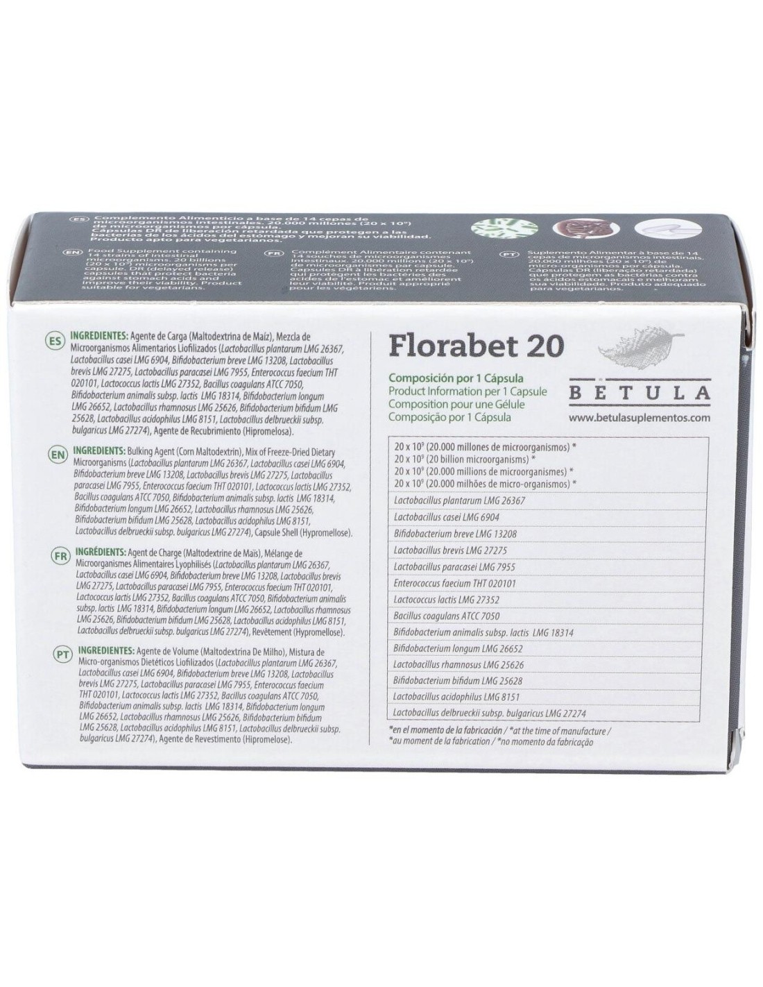 Florabet 20 de Betula disminuye infecciones gastrointestinales. Producen bacteriocinas que eliminan microorganismos perjudiciales. Además compiten por nutrientes y alojamiento y generan ácidos (láctico, acético...) que dificultan su crecimiento.Ayuda con alergias y enfermedades tópicas (dermatitis, rinitis, asma). Los probióticos favorecen una mayor tolerancia inmunológica y un estado de menor inflamación corporal que favorecen su control. Mejora las digestiones. Sintetizan enzimas digestivas y disminuyen producción de gases.También estimulan el tránsito intestinal.Los probióticos mejoran integridad intestinal, favorecen mantenimiento de barrera intestinal y reducen inflamación. Reducen absorción de sustancias tóxicas como amoníaco, aminados e indol. Presentan efecto preventivo frente al cáncer de colon.Composición activa por cápsula:20.000 millones de microorganismos (L. plantarum L.MG 26367, B. breve LIMG 13208, L. paracasei L.MG 7955, L. lactis L.MG 27352, B. animalis ssp lactis IMG 18314, L. rhamnosus LMG 25626, L. acidophilus LMG 8151, L. casei LIMG 6904, L. brevis LIMG 27275, E. Faecium THT 020101, B. coagulans ATCC 7050, B. longum L.MG 26652, B. bifidum LMG 25628, L. Delbrueckii subsp. bulgaricus L.MG 27274).Ingredientes:Agente de Carga (Maltodextrina de Maíz), Mezcla de Microorganismos Alimentarios Liofilizados (Lactobacillus plantarum LMG 26367, Lactobacillus casei LMG 6904, Bifidobacterium breve LMG 13208, Lactobacillus brevis LMG 27275, Lactobacillus paracasei LMG 7955, Enterococcus faecium THT 020101, Lactococcus lactis LMG 27352, Bacillus coagulans ATCC 7050, Bifidobacterium animalis ssp lactis LMG 18314, Bifidobacterium longum LMG 26652, Lactobacillus rhamnosus LMG 25626, Bifidobacterium bifidum LMG 25628, Lactobacillus acidophilus LMG 8151, Lactobacillus delbr bulgaricus LMG 27274), Agente de Recubrimiento (Hipromelosa).Modo de empleo:Tomar 1 cápsula diaria con una comida, preferiblemente con el desayuno.Presentación:Envase de 30 cápsulas.Recomendaciones y advertencias:Apto para vegetarianos. No ingerir con bebidas ni alimentos calientes, ya que el calor mata a los microorganismos. Si se toman antibióticos, esperar al menos dos horas antes de tomarlo.