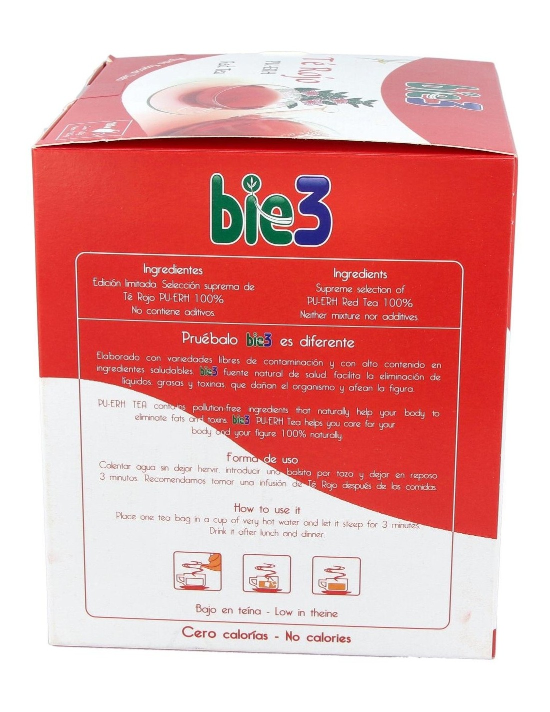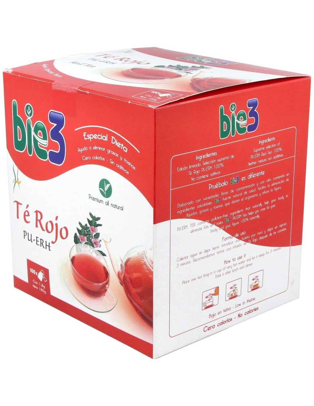 BIE 3Bio3 | Bio3 té rojo 1,5g 100 filtrosCuando hacemos dieta, una buena forma de complementar nuestro esfuerzo por adelgazar puede ser tomar infusiones adelgazantes que nos ayudarán a disminuir los líquidos, el colesterol y otras sustancias perjudiciales para nuestro organismo.El té rojo de Bio3 es una infusión rica en taninos y polifenoles procedentes de cultivos ecológico.
