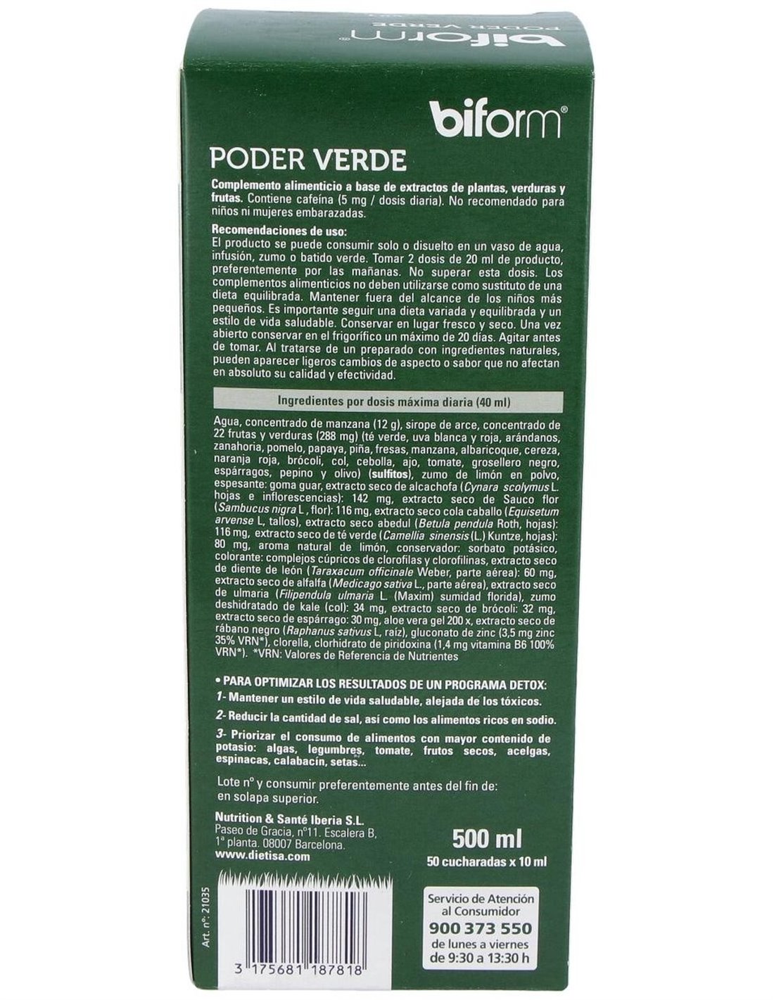 BIFORM®Biform Poder Verde 500ml es un complemento alimenticio que contribuye a adelgazar y eliminar los líquidos retenidos en el cuerpo.Sirve de ayuda en dietas de adelgazamiento y para depurar el organismo, sobre todo para personas que necesitan realizar dietas hipocalóricas.