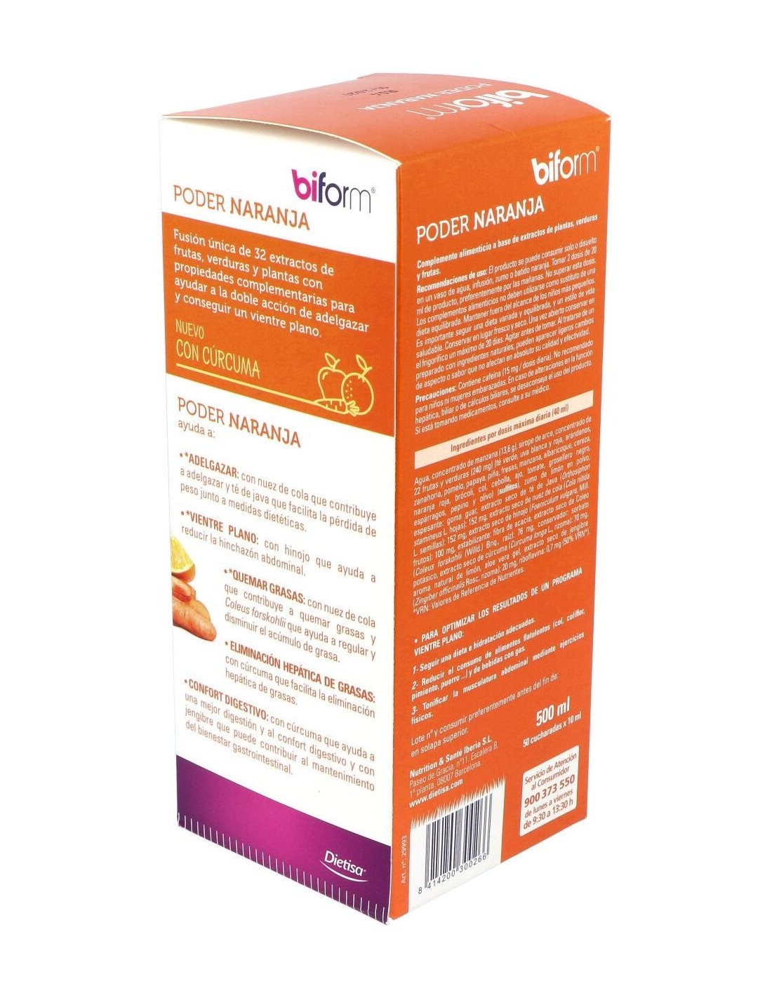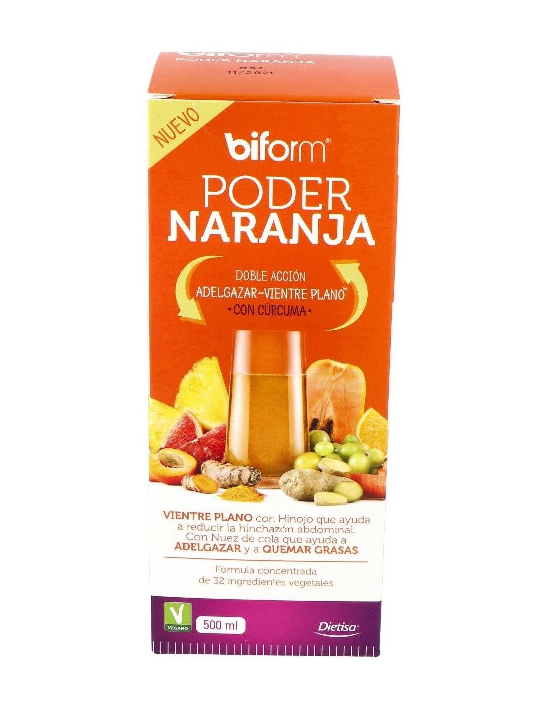 BIFORM®Dietisa Biform Poder Naranja 500ml es un complemento alimenticio indicado para ayudar a quemar grasas.Con ingredientes naturales, contiene té verde, uva blanca y roja, arándanos, zanahoria, pomelo, papaya, piña, fresas, manzana, albaricoque, cereza, naranja roja, brócoli, col, cebolla, ajo, tomate, grosellero negro, espárragos, pepino y olivo.