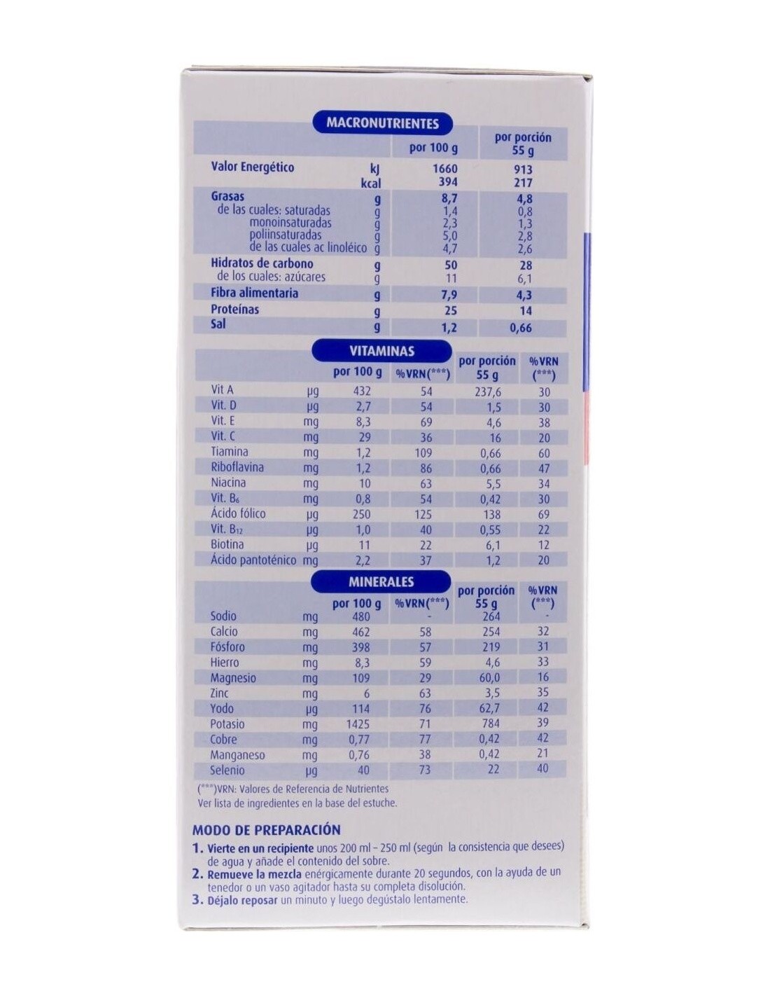 Verter en un recipiente unos 200 ml 250 ml (según la consistencia deseada) de agua bien fría y añadir el contenido del sobre. Remover la mezcla enérgicamente durante 20 segundos, con la ayuda de un tenedor o un vaso agitador hasta su completa disolución. Dejar reposar 1 minuto y consumir.