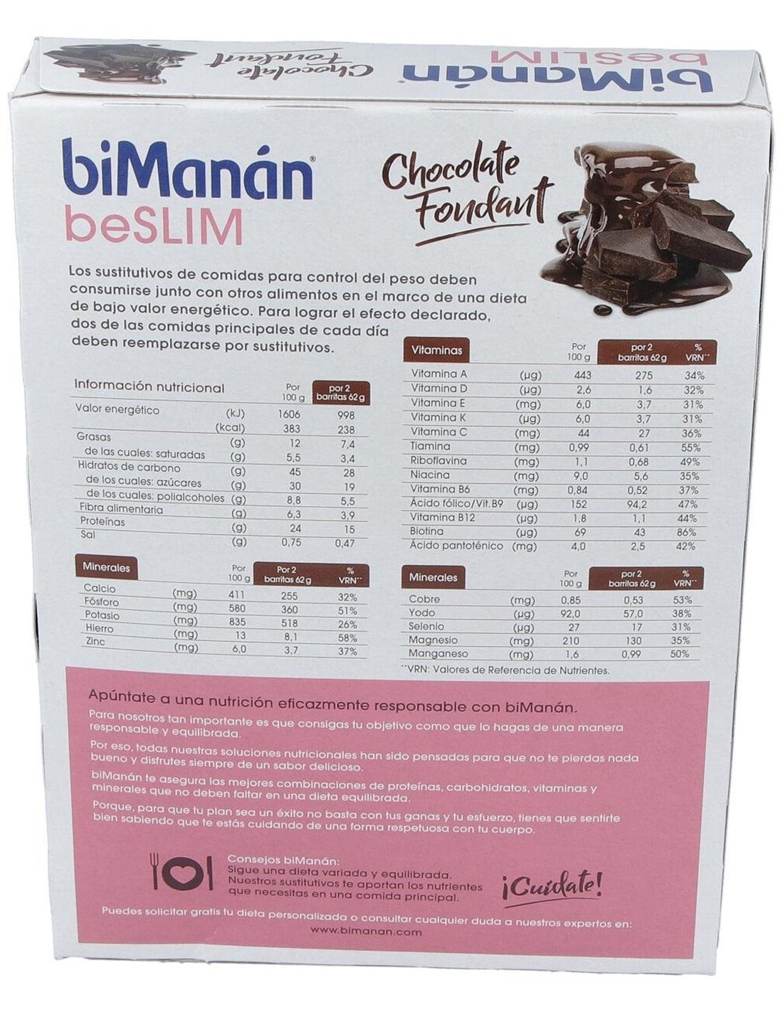 BIMANANLas Barritas Chocolate Fondant 10Ud. de Bimanan son un snack bajo en calorías para personas que buscan controlar su ingesta. Ofrecen una opción práctica y equilibrada gracias a su fórmula adaptada para dietas.