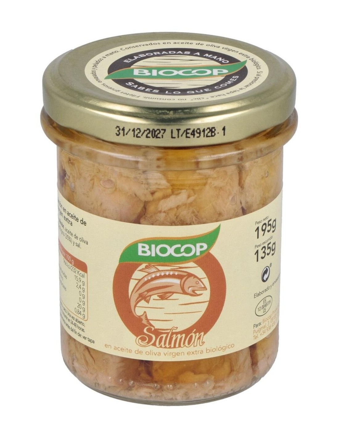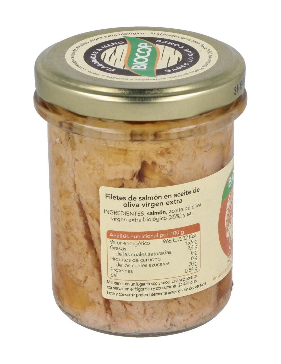 BIOCOPIngredientes:Salmón, aceite de oliva virgen extra*, sal marina. (*) De cultivo ecológico.Valor nutricional por 100 gramos: