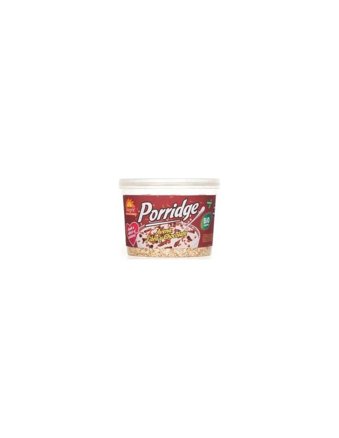 Este producto de la marca Biográ es una mezcla de avena con chocolate ideal para desayunos y meriendas. Se trata de un alimento de textura gruesa y crujiente. La avena está tratada de manera que su grano se perciba al tacto, por ello tiene la textura propia de los alimentos integrales. Tiene sabor dulce aunque contiene azúcar en baja cantidad. Se digiere fácilmente y no ocasiona molestias estomacales. Se recomienda en personas con problemas digestivos. Puede ingerirse como merienda o como desayuno y es un alimento ideal para personas que deben llevar una dieta rica en fibra. El contenido del envase es de 220gr y este puede ser reutilizado. El porridge de Biográ debe mantenerse alejado de la humedad para prolongar su duración. Apto para cualquier persona, no tiene contraindicaciones.