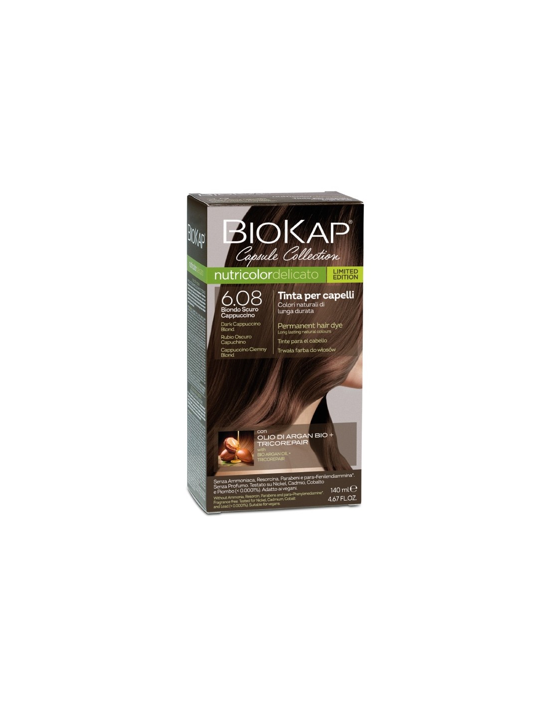 BIOKAPDescubre el tono perfecto con Delicato 6.08 Rubio Oscuro Capuchino Ed. Limitada de BIOKAP. Esta coloración ofrece un rubio oscuro con matices capuchino, ideal para un look natural y sofisticado. Su fórmula cuidada protege y nutre el cabello, dejando un acabado brillante y duradero. Perfecto para quienes buscan un cambio sutil pero elegante, respetando la salud del cabello. BIOKAP combina calidad y cuidado en cada aplicación para realzar tu belleza con un color vibrante y lleno de vida.