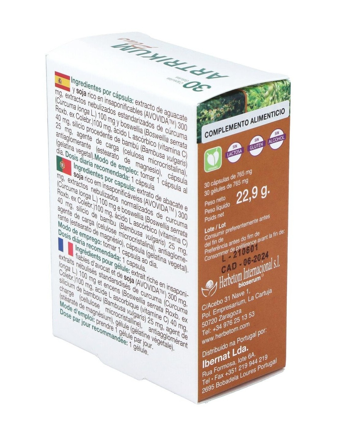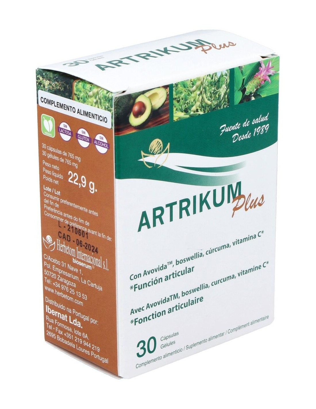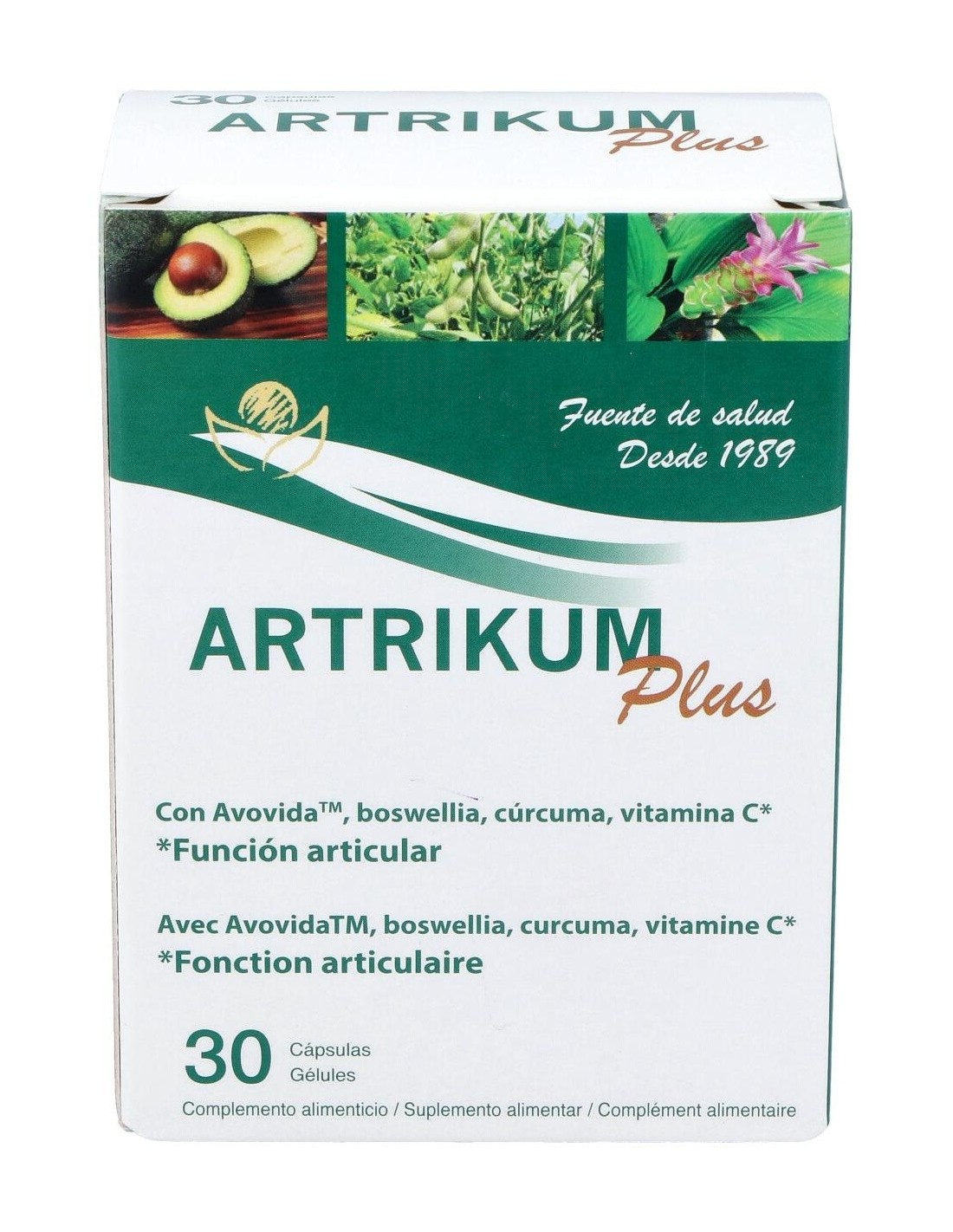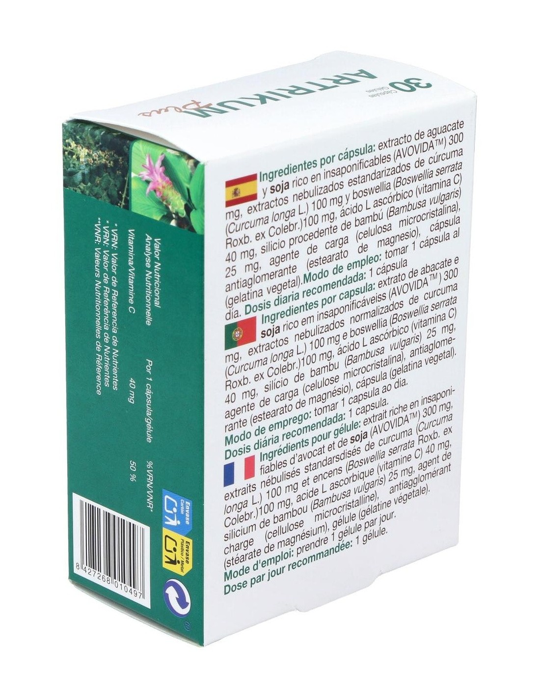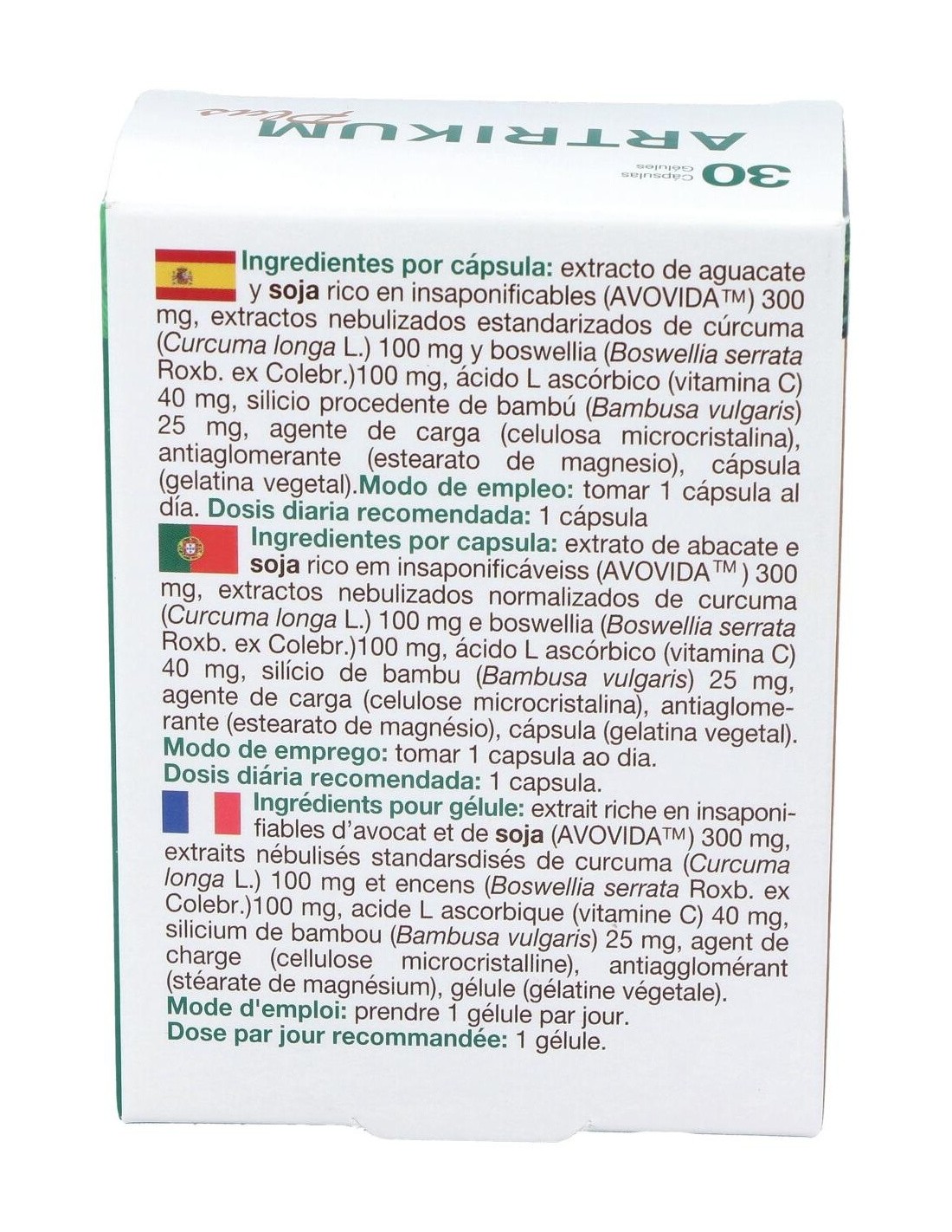 Ingredientes por cápsula: extracto de aguacate y soja rico en insaponificables (AVOVIDA ) 300 mg, extractos nebulizados estandarizados de cúrcuma (Curcuma longa L.) 100 mg y boswellia (Boswellia serrata Roxb. ex Colebr.)100 mg, ácido L ascórbico (vitamina C) 40 mg, silicio procedente de bambú (Bambusa vulgaris) 25 mg, agente de carga (celulosa microcristalina), antiaglomerante (estearato de magnesio), cápsula (gelatina vegetal).