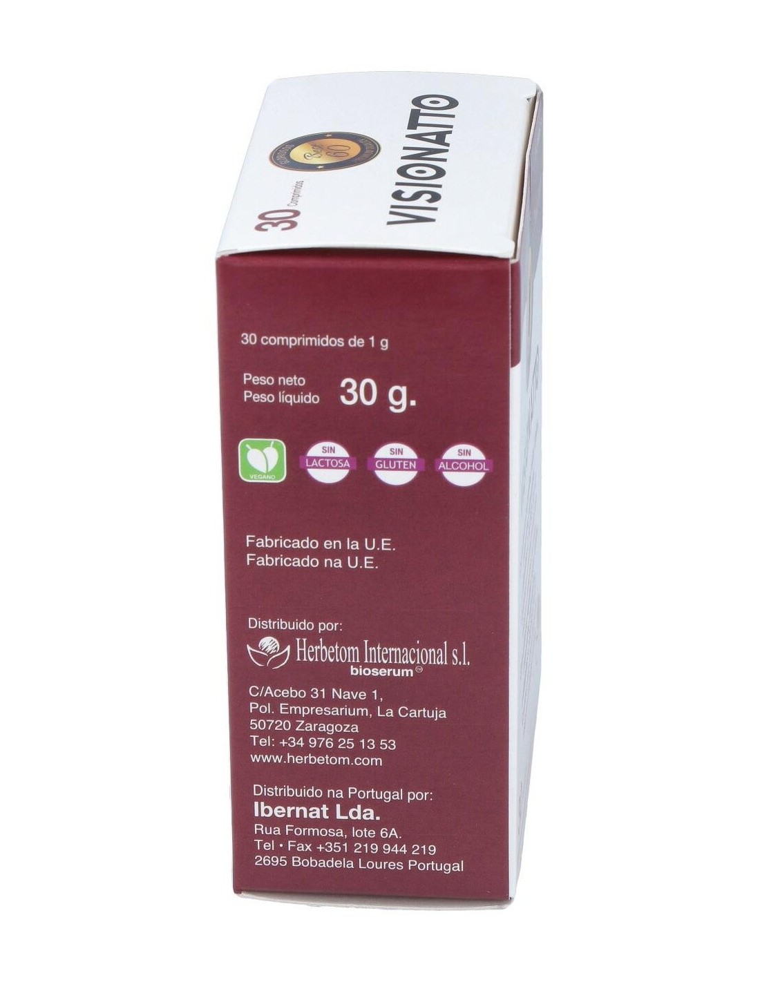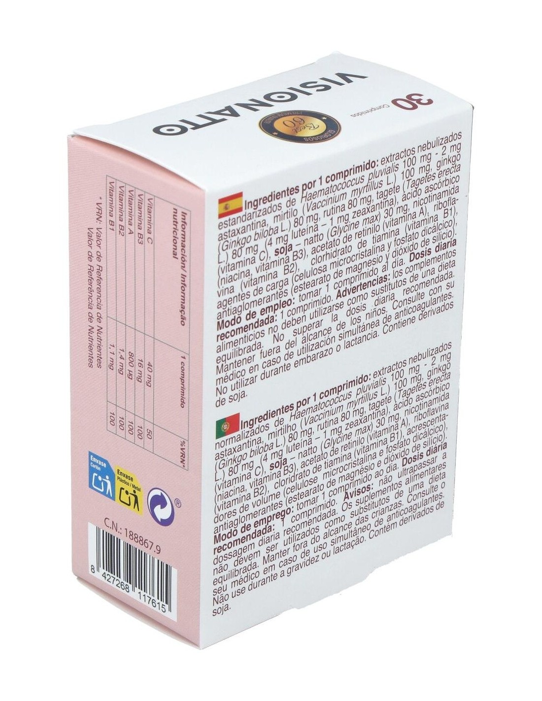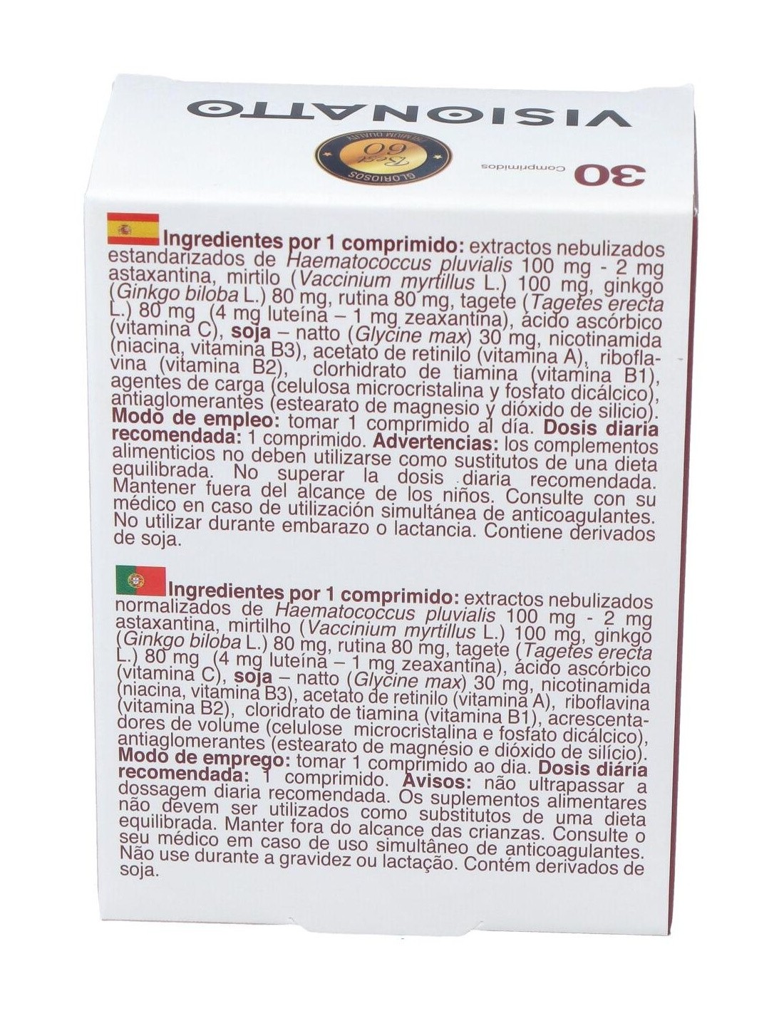 Las pantallas de los móviles y ordenadores, la sequedad del aire por la calefacción, realizar esfuerzos con la vista o el deterioro de la vista por la edad perjudica la salud de nuestros ojos. Además, tener un colesterol elevado, el consumo de tabaco, la edad y llevar una vida sedentaria puede aumentar el riesgo de que se formen coágulos en el interior de los vasos y se formen obstrucciones vasculares, pudiendo afectar a la vena central de la retina o bien a algunas de las ramas dentro del ojo. Visionatto es un conjunto de ingredientes activos y vitaminas que ayudan a mantener una buena salud ocular y contribuyen a una visión en condiciones normales. Composición activa por comprimido:
