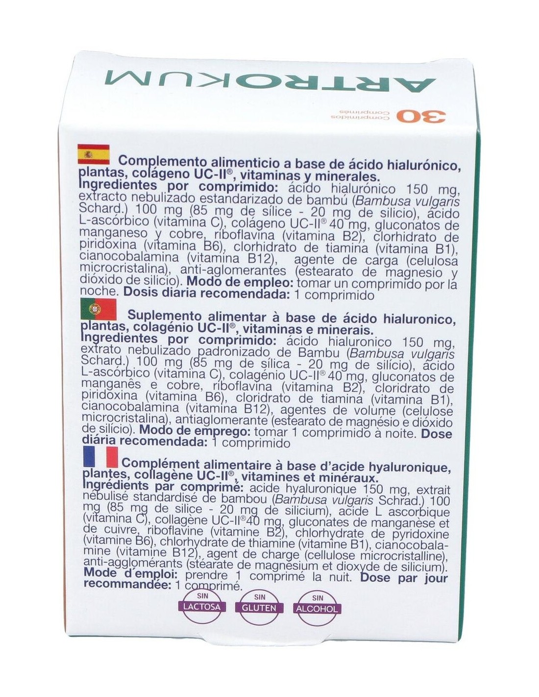 Ácido hialurónico 150 mg, extracto nebulizado estandarizado de bambú (Bambusa vulgaris Schard.) 100 mg (85 mg de sílice, 20 mg de silicio), ácido L- ascórbico (vitamina C), colágeno UCII® 40 mg, gluconatos de manganeso y cobre, riboflavina (vitamina B2), clorhidrato de piridoxina (vitamina B6), clorhidrato de tiamina (vitamina B1), agente de carga (celulosa microcristalina), antiaglomerantes (estearato de magnesio y dióxido de silicio).