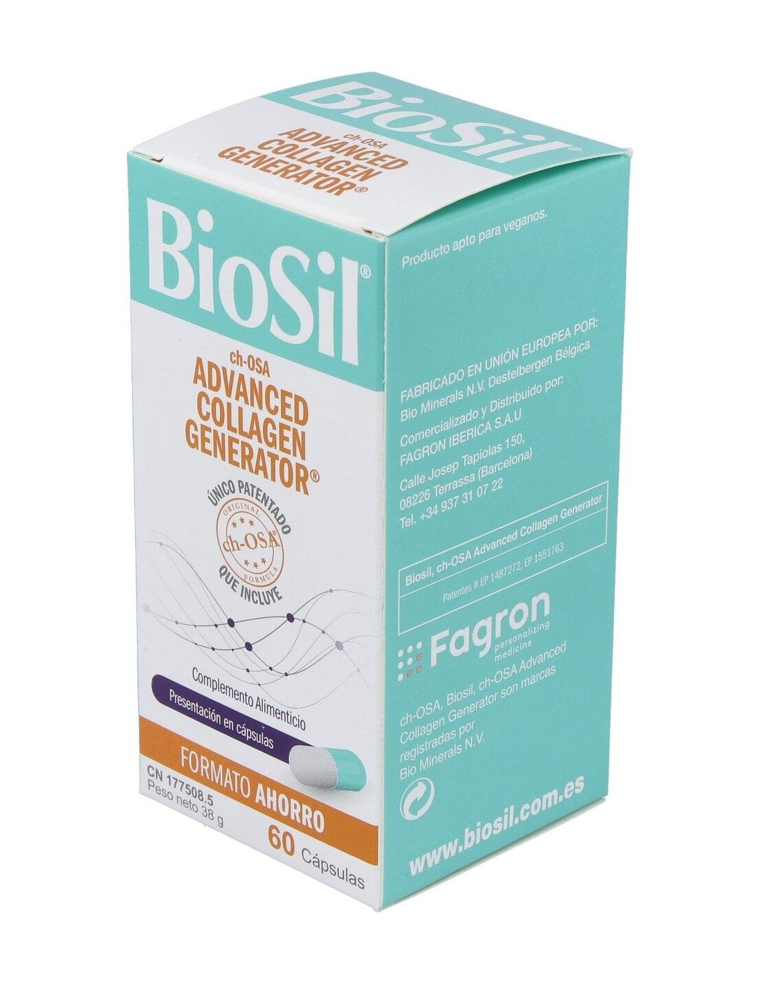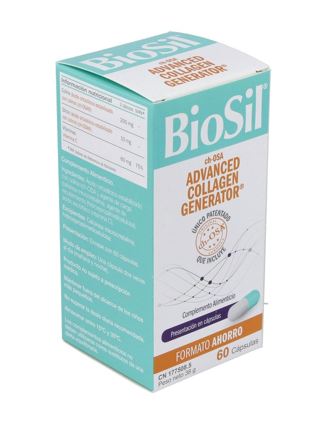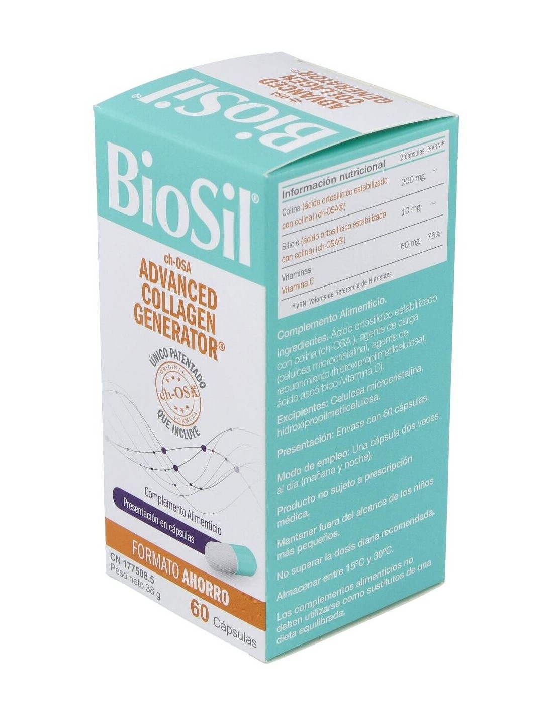 BIOSILBIOSIL | BioSil 60cápsEl colágeno es una proteína que genera fibras muy resistentes y flexibles, las cuales forman parte de muchos tejidos de nuestro cuerpo: articulaciones, huesos, piel, músculos y tendones.Nuestro organismo produce colágeno, pero a partir de los 30 años pierde capacidad para generar esta proteína, por lo que las zonas que contienen colágeno empezarán a envejecer y se puede perder movilidad en las articulaciones o tersura en la piel.