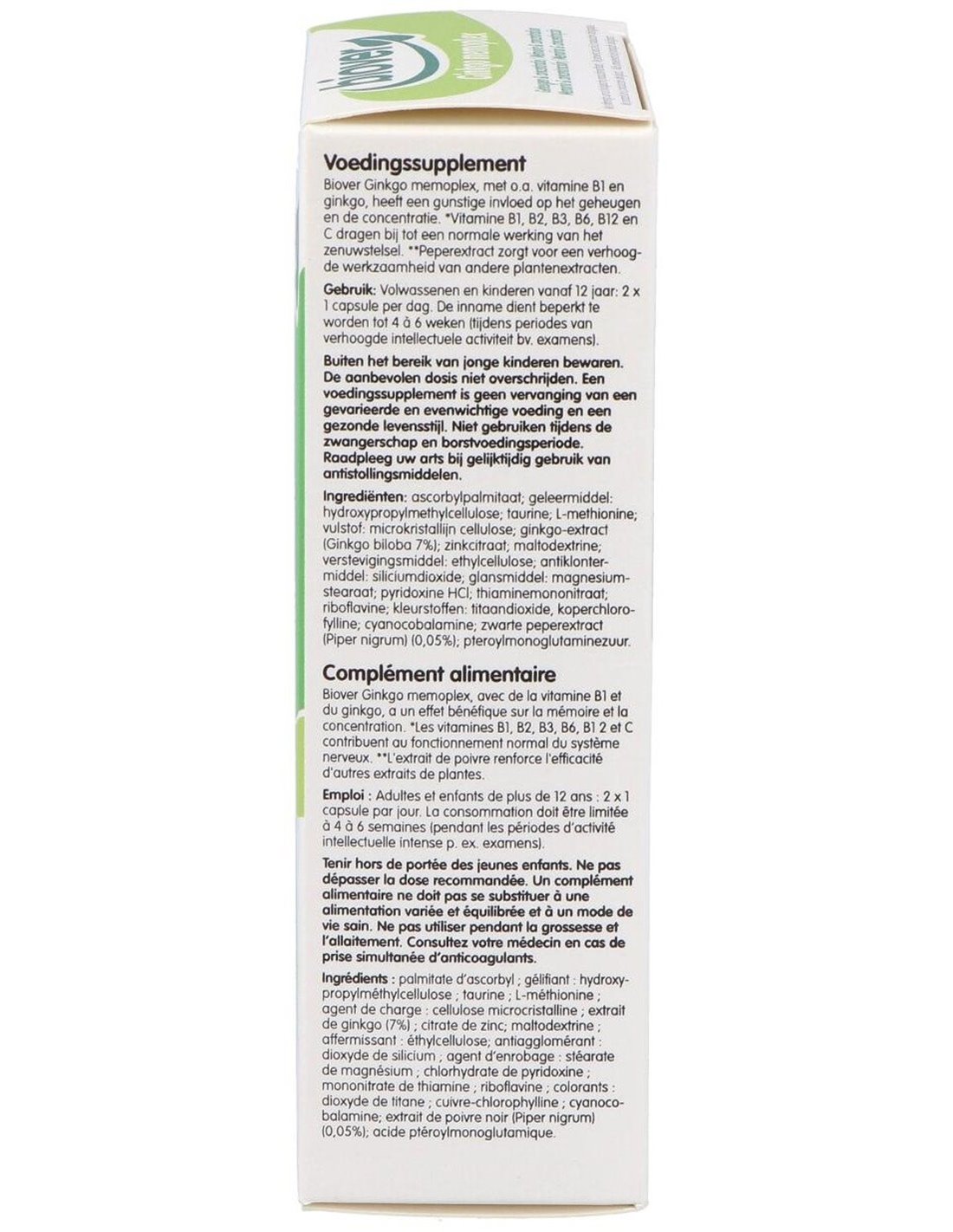 BIOVERMemoria y Concentración (Ginkgo Memoplex 45Cap. de Biover) es un suplemento para adultos que apoya las funciones cognitivas y la concentración mediante una fórmula con extracto de ginkgo biloba.