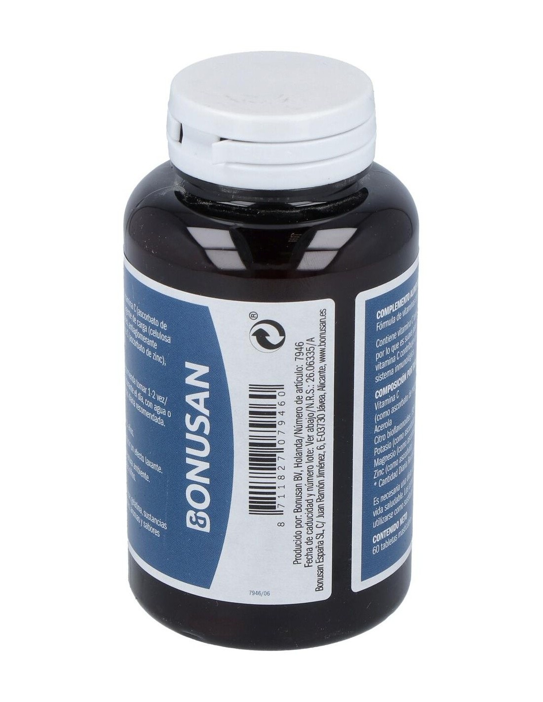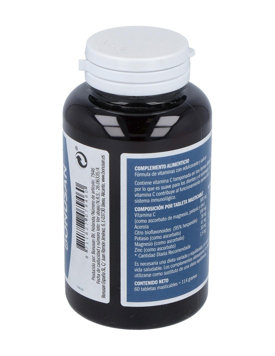 Edulcorante (fructosa, manitol), vitamina C (ascorbato de magnesio, ascorbato de potasio), agente de carga (celulosa (HPC)), acerola, citro bioflavonoides, antiaglomerante (estearato de magnesio), vitamina C (ascorbato de zinc), sabor (sabor natural de naranja).