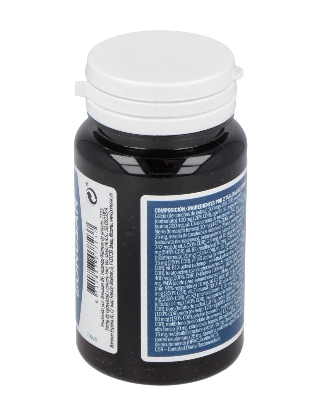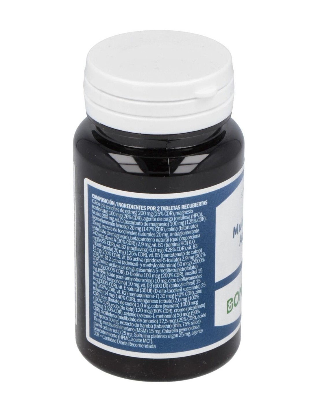 Conchas de ostras granuladas, carbonato de magnesio, agente de carga (celulosa microcristalina), taurina, ascorbato de magnesio, fumarato ferroso, bitartrato de colina, mezcla de tocoferoles naturales, antiaglomerante (sales magnésicas de ácidos grasos), agente de carga (hidroxipropilcelulosa), citrato de zinc, alfa-tocoferil succinato, acido alfa lipoico, betacaroteno, chlorella (Chlorella pyrenoidosa, contiene naturalmente sulfitos), espirulina (Spirulina platensis, contiene naturalmente sulfitos), kelp (Laminaria digitata), nicotinamida, bioflavonoides de cítricos, pantotenato de calcio, bambú (Bambusa arundinacea), inositol, metilsulfonilmetano, ácido paraaminobenzoico, lisinato de cobre, selenio-L-metionina, borato de sodio, tiamina, colecalciferol, citrato de manganeso, riboflavina, biotina, piridoxal-5-fosfato, menaquinona-7, ácido (6S)-5-metiltetrahidrofólico sal de glucosamina, picolinato de cromo, adenosilcobalamina, metilcobalamina, molibdato de amonio, agente de recubrimiento (hidroxipropilmetilcelulosa), aceite MCT.