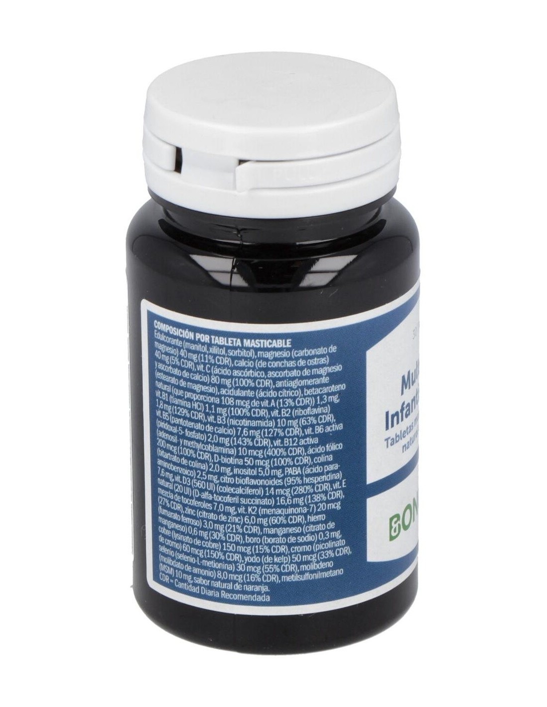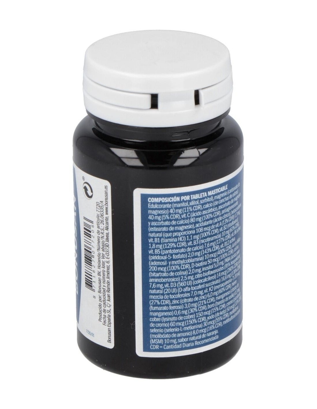 Edulcorante (manitol), edulcorante (xilitol), edulcorante (sorbitol), carbonato de magnesio, conchas de ostras granuladas, antiaglomerante (sales magnésicas de ácidos grasos), ácido L-ascórbico, acidulante (ácido cítrico), ascorbato de calcio, ascorbato de magnesio, sabor (aroma de naranja), mezcla de tocoferoles naturales, citrato de zinc, D-alfa-tocoferil hidrógeno succinato, betacaroteno, bioflavonoides de cítricos, Laminaria digitata (kelp), menaquinona-7, metilsulfonilmetano, nicotinamida, fumarato ferroso, calcio D-pantotenato, colecalciferol, selenio-L-metionina, bitartrato de colina, inositol, piridoxal 5'-fosfato, borato de sodio, ácido para-aminobenzoico, D-biotina, citrato de manganeso, riboflavina, lisinato de cobre, tiamina hidrocloruro, picolinato de cromo, ácido fólico, molibdato de amonio, adenosilcobalamina, metilcobalamina.