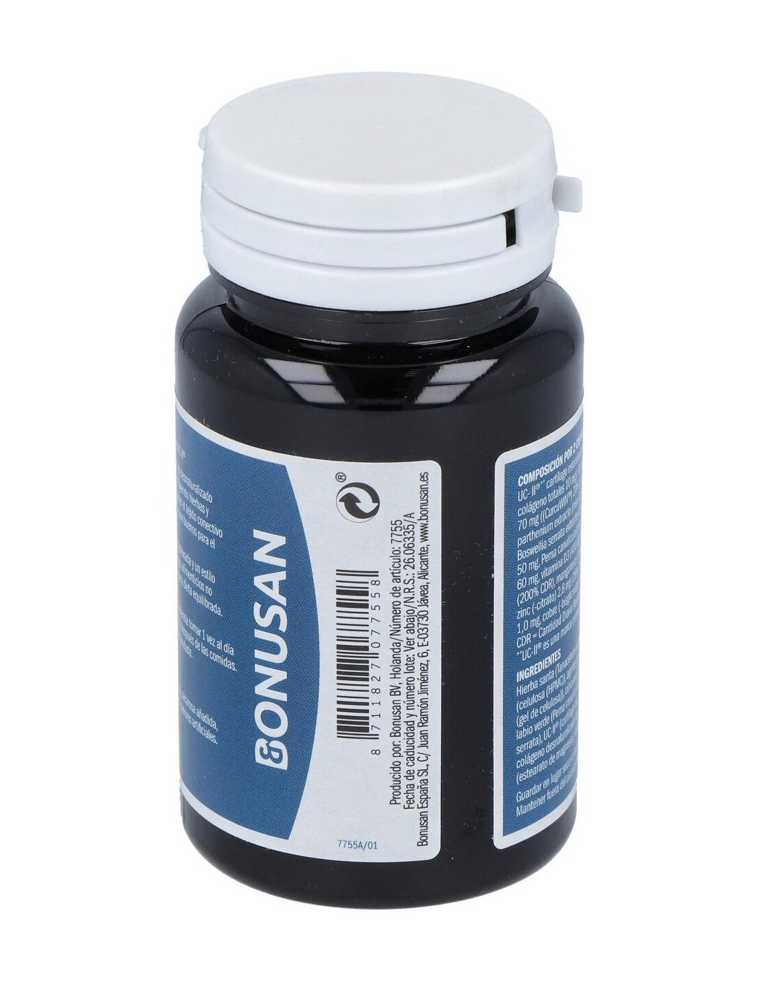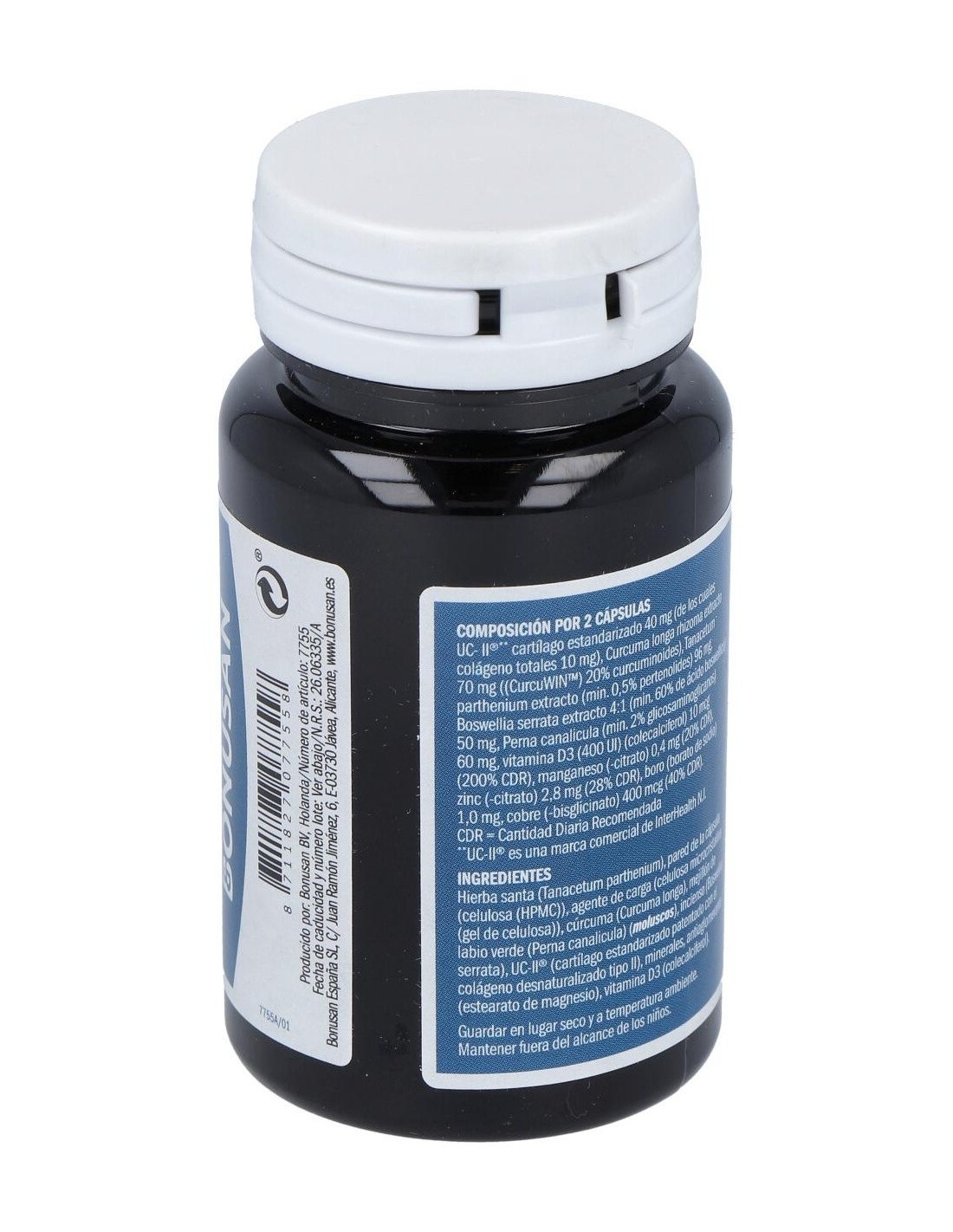Pared de la cápsula (hidroxipropilmetilcelulosa), agente de carga (celulosa microcristalina), Tanacetum parthenium, Curcuma longa, Perna canalicula (moluscos), Boswellia serrata, colágeno no desnaturalizado tipo II, antiaglomerante (sales magnésicas de ácidos grasos), borato de sodio, citrato de zinc, colecalciferol, bisglicinato de cobre, citrato de manganeso.