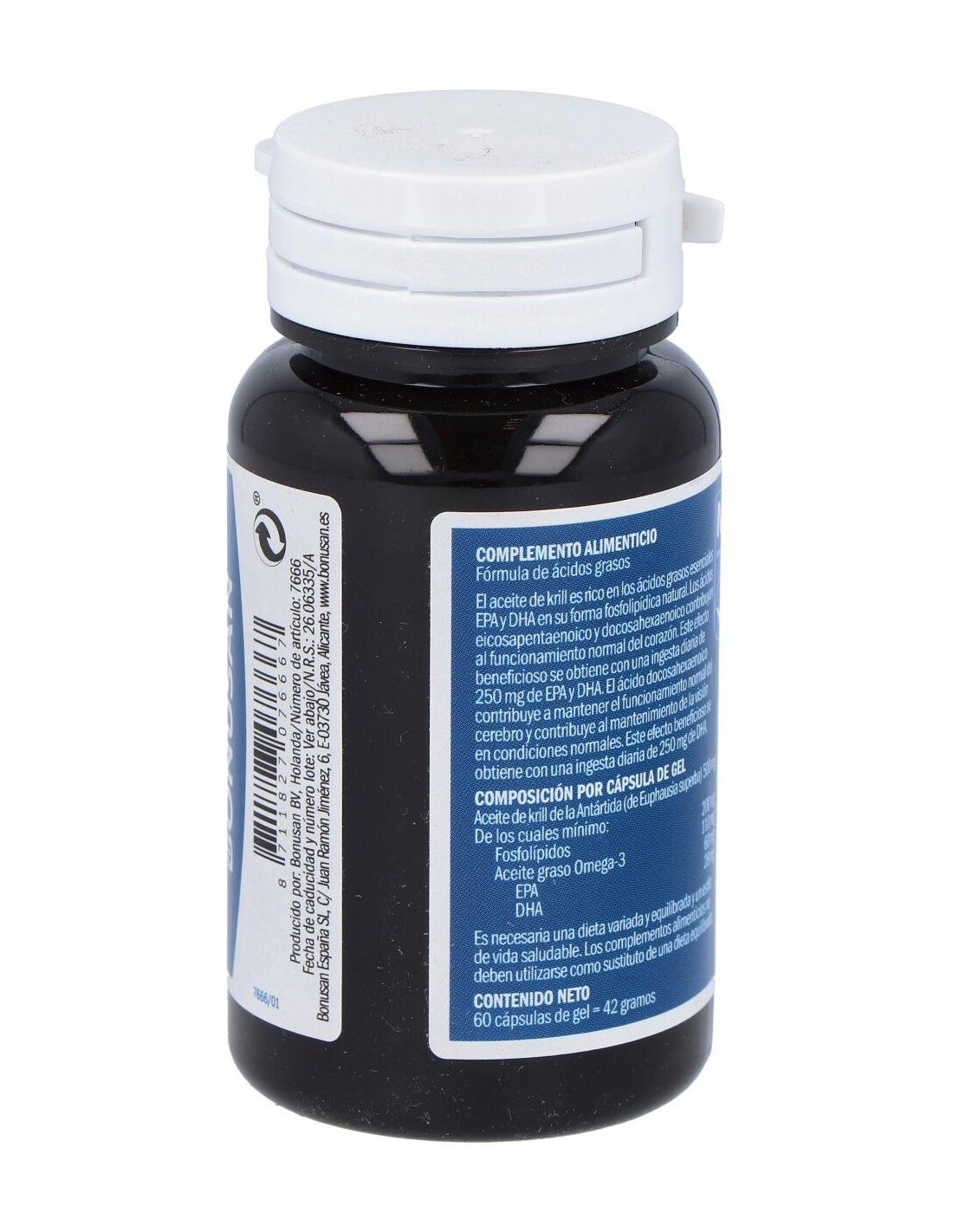 500 mg de aceite de krill antártico (200 mg de fosfolípidos, 110 mg de aceite omega 3 (60 mg de EPA y 28 mg DHA)).