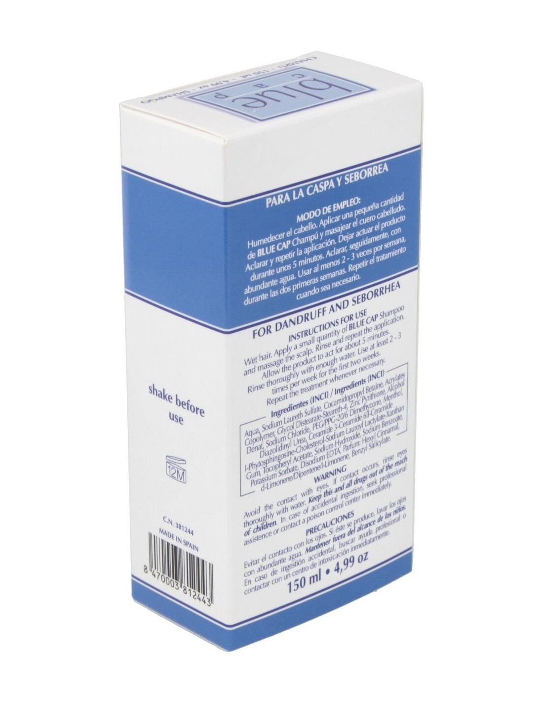 Indicado para el cuidado del cuero cabelludo afectado por caspa, seborrea seca o seborrea grasa. En el caso de la caspa, disminuye el picor y la descamación. Normaliza la actividad de las células del cuero cabelludo y tiene una influencia positiva sobre el crecimiento del cabello. Indicado como complemento del Blue Cap Loción. Para la seborrea seca, se recomienda que el uso sea mixto mediante la aplicación de loción y champú. Para la seborrea grasa, bastará con la aplicación del champú.