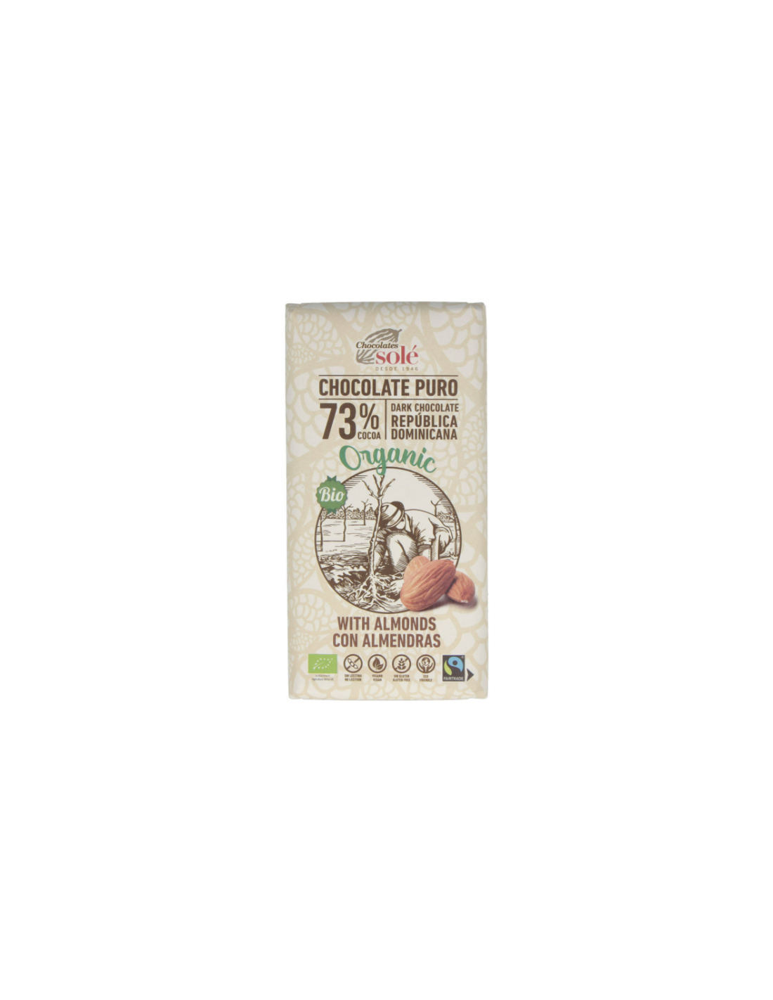 Chocolate negro puro 73% ecológico con almendras, elaborado con materias primas que provienen exclusivamente de cultivo ecológico controlado, libre de fertilizantes y pesticidas, o sustancias como la lecitina, presente en las membranas de las células vegetales y animales. Los principales ingredientes como el cacao provienen 100% de la República Dominicana y la caña de azúcar sin refinar de Brasil. No contiene gluten. Apto para veganos. Conservar en lugar fresco y seco.