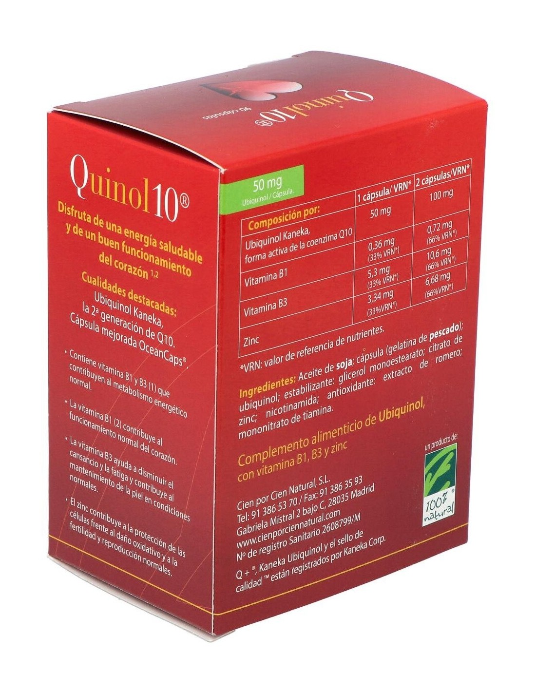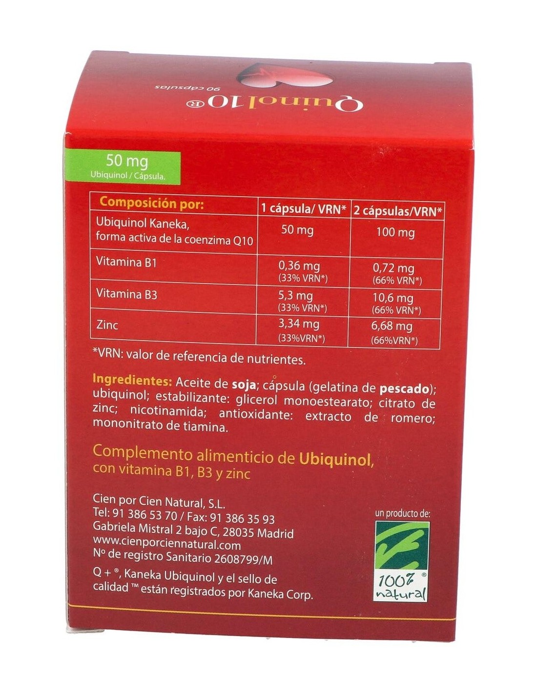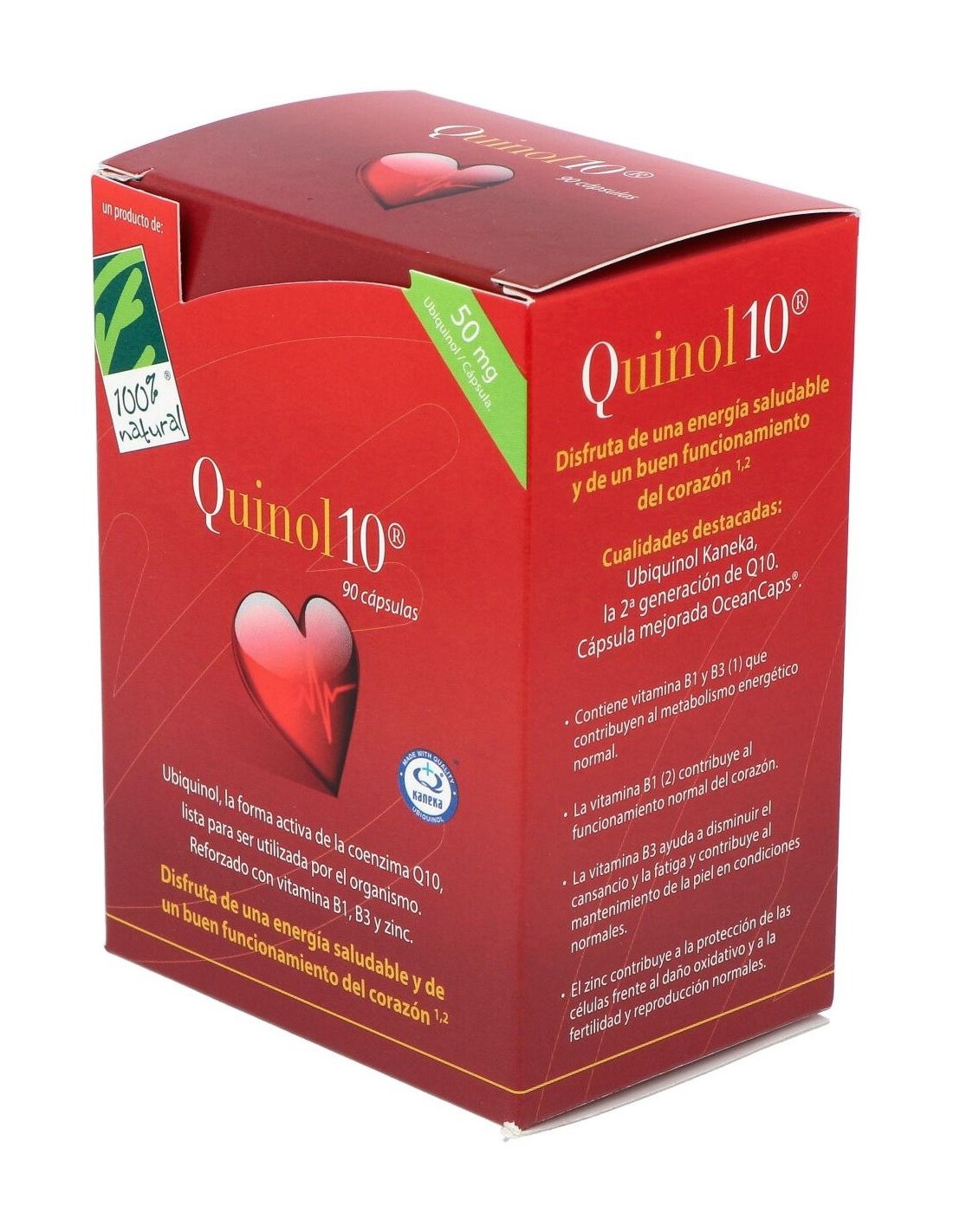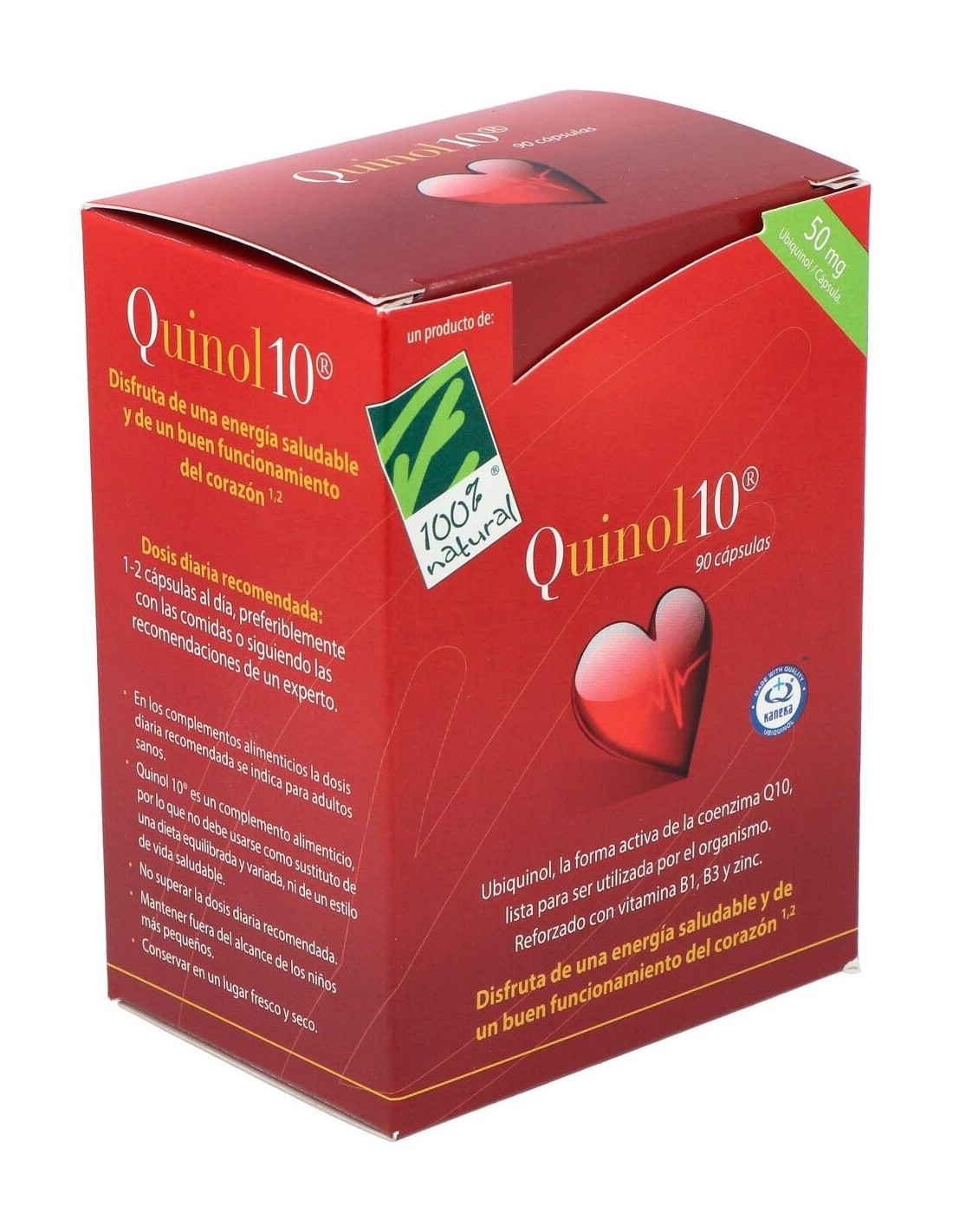CIEN POR CIEN NATURAL100% Natural Quinol 10 90cápsulas es un complemento perfecto para todos, pero para quienes estén por los 40 años es especialmente recomendable, ya que hay que tener en cuenta que la capacidad de transformar la ubiquinona en ubiquinol disminuye con la edad y en este producto la coenzima Q10 ya se presenta en forma de Ubiquinol. Contiene también vitamina B1 que contribuye al funcionamiento normal del sistema cardiovascular y vitamina C que ayuda al metabolismo energético normal.