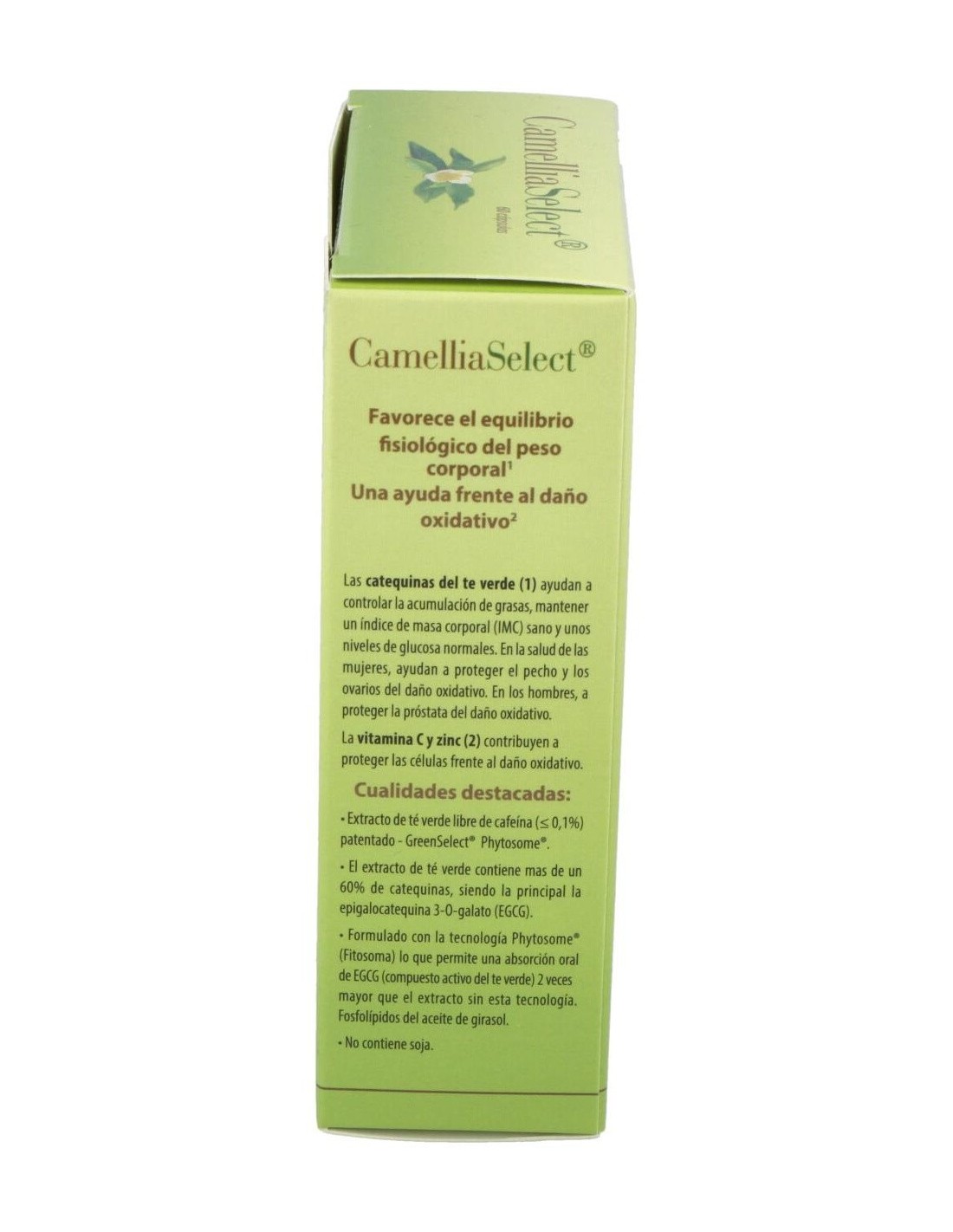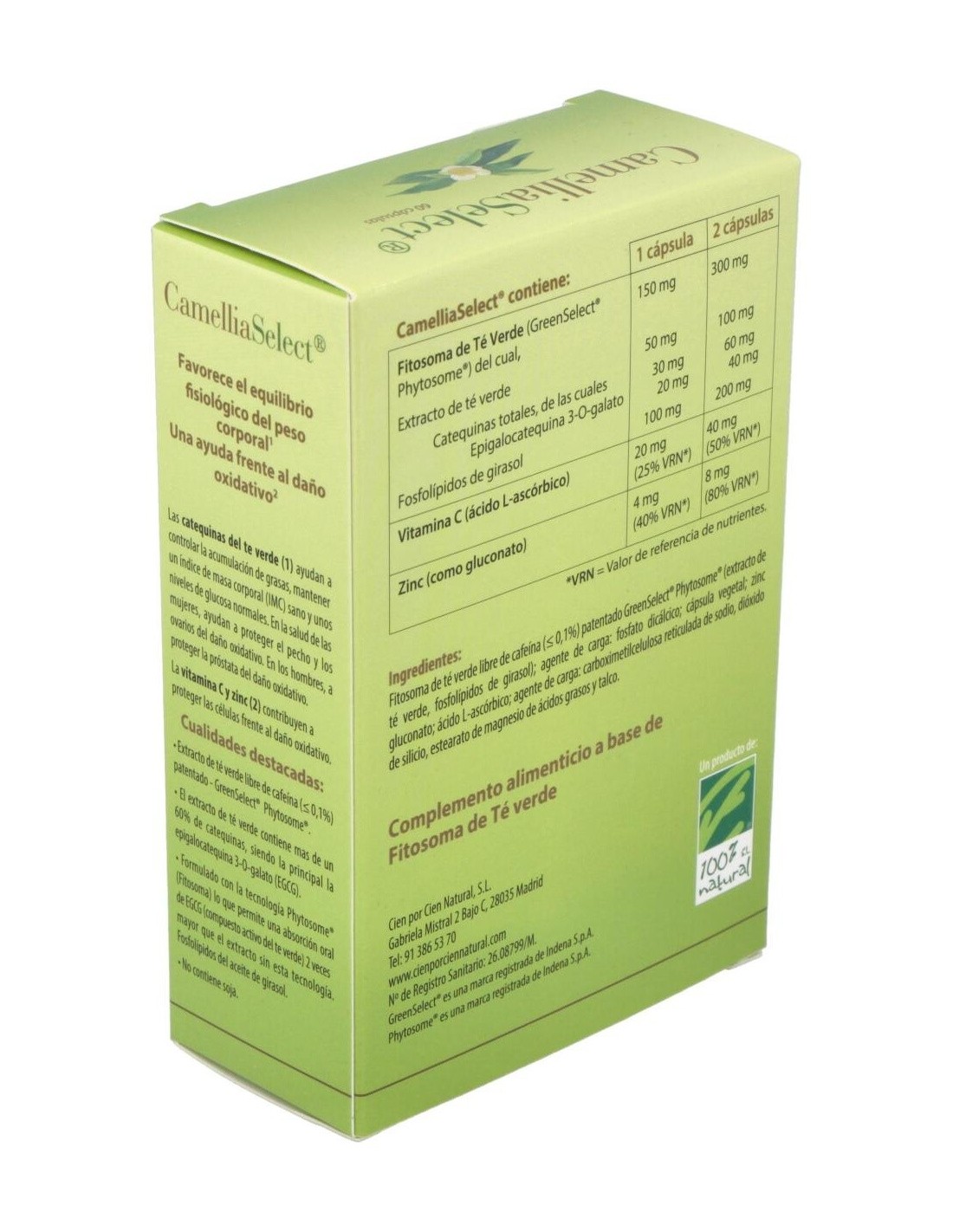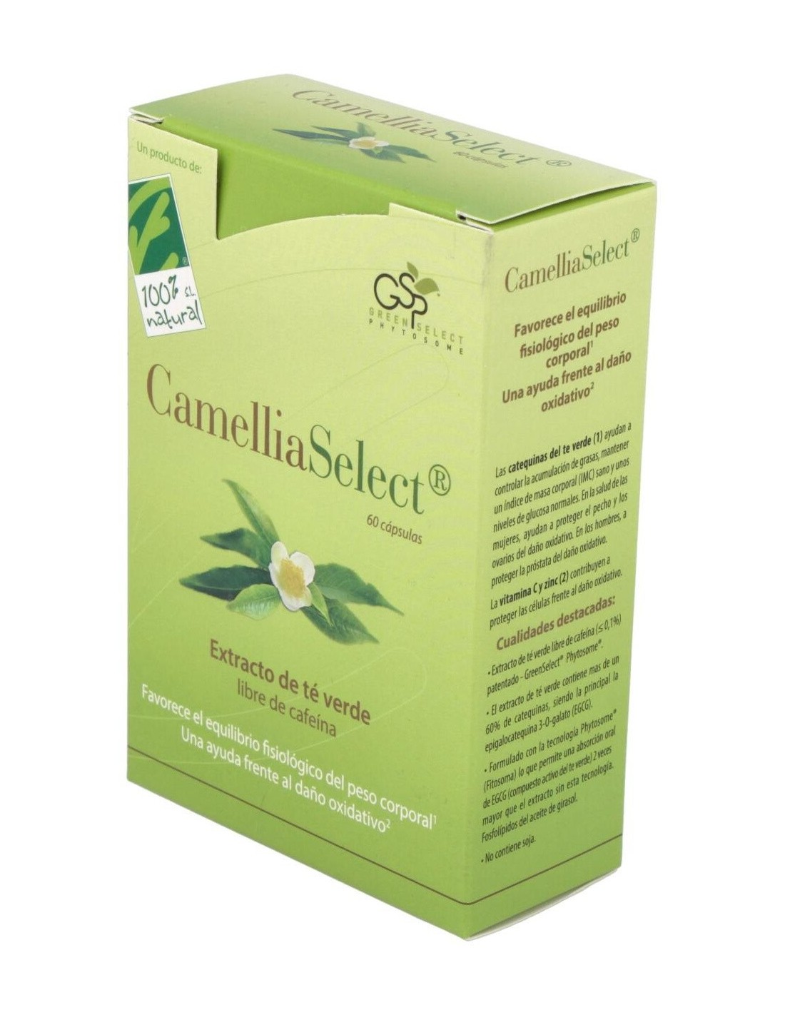 CIEN POR CIEN NATURALCamelliaSelect®es un complemento alimenticio que contiene un extracto seco de hojas jóvenes de té verde, vitamina C (Ácido L-ascórbico PureWay-C®) y z
