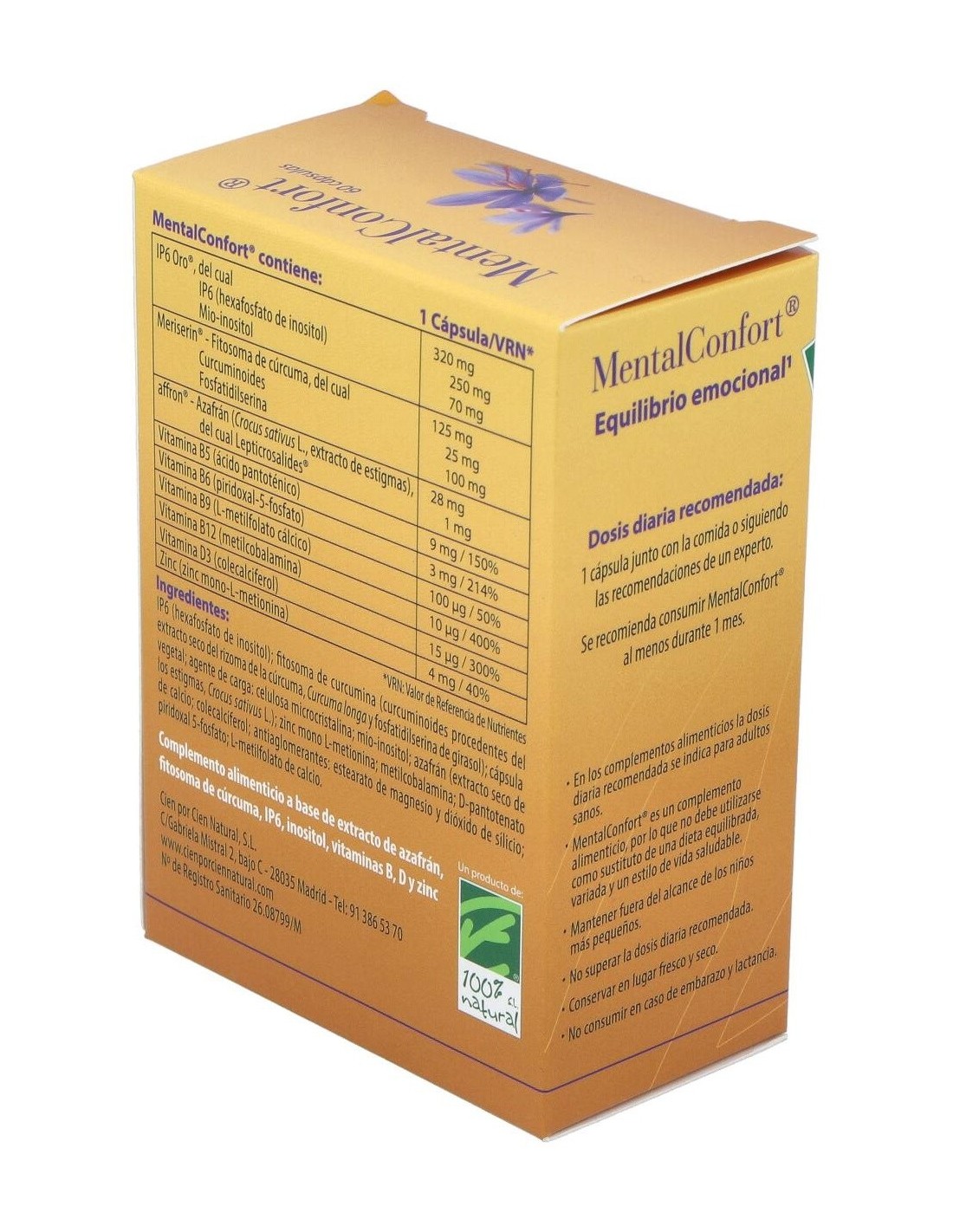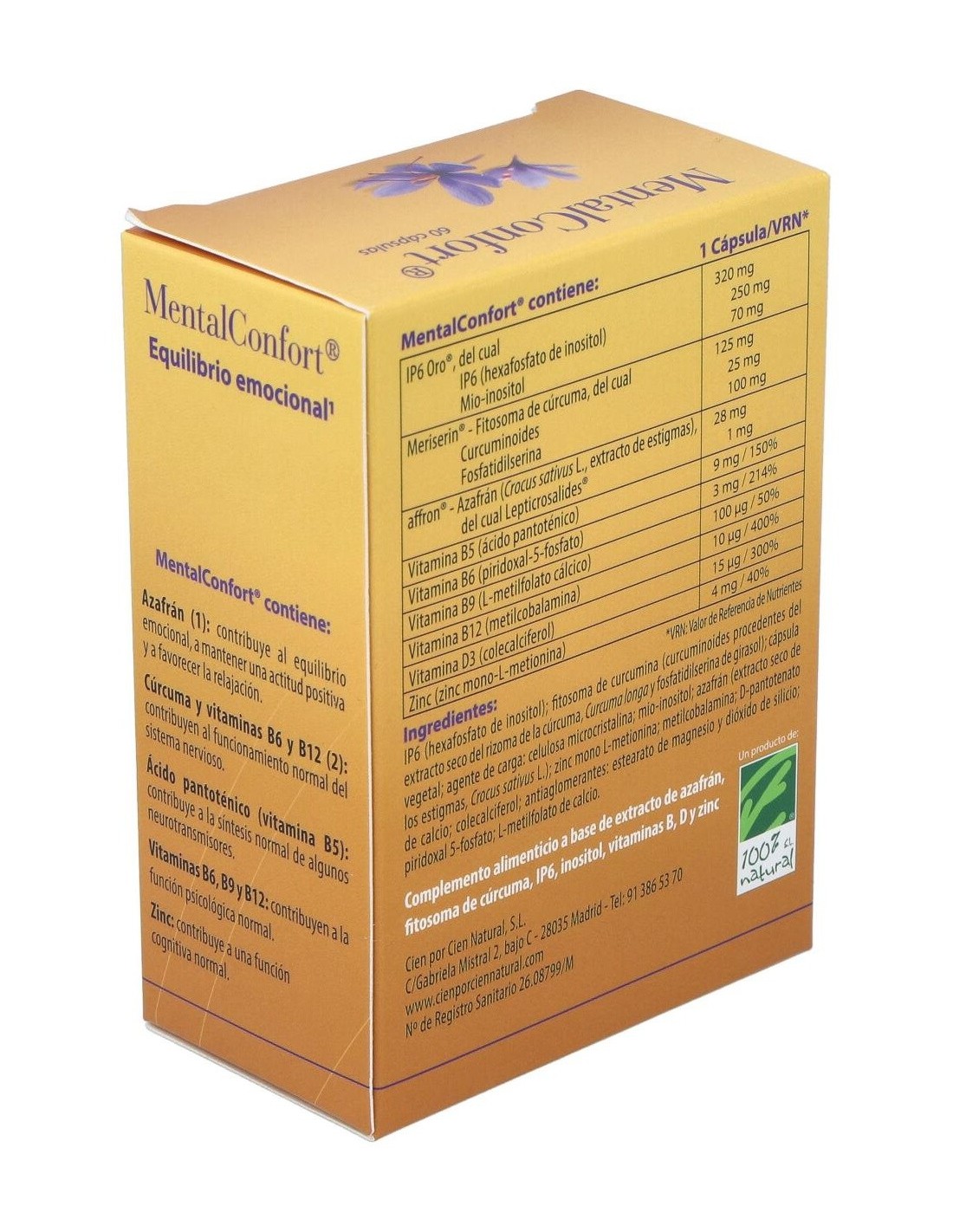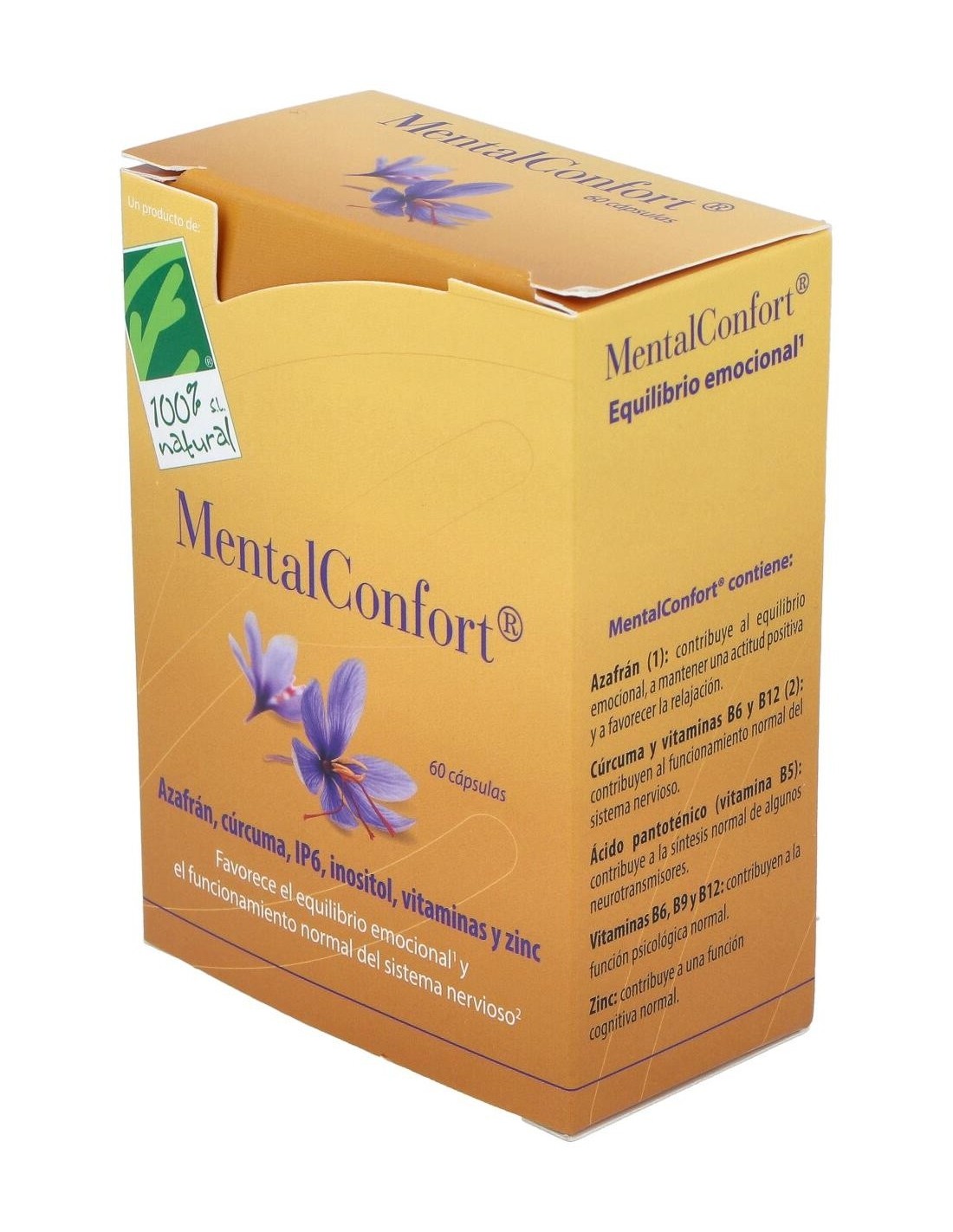 Mentalconfort 60Cap. de Cien Por Cien Natural ofrece una opción basada en ingredientes naturales para quienes desean complementar su bienestar mental con un producto de composición transparente y accesible.