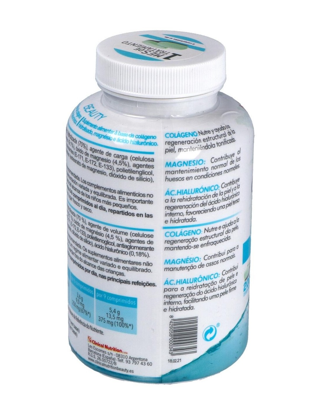 Proteína de colágeno hidrolizada (70%), Agente de carga (Celulosa microcristalina), Carbonato de magnesio (9,1%), Óxido de magnesio (4,5%), Agentes de recubrimiento [Alcohol polivinílico, Colorantes (E-171, E-172, E-133), Polietilenglicol, Antiaglomerante (talco)], Antiaglomerantes (Estearato de magnesio, Dióxido de silicio), Ácido hialurónico (0,18%).