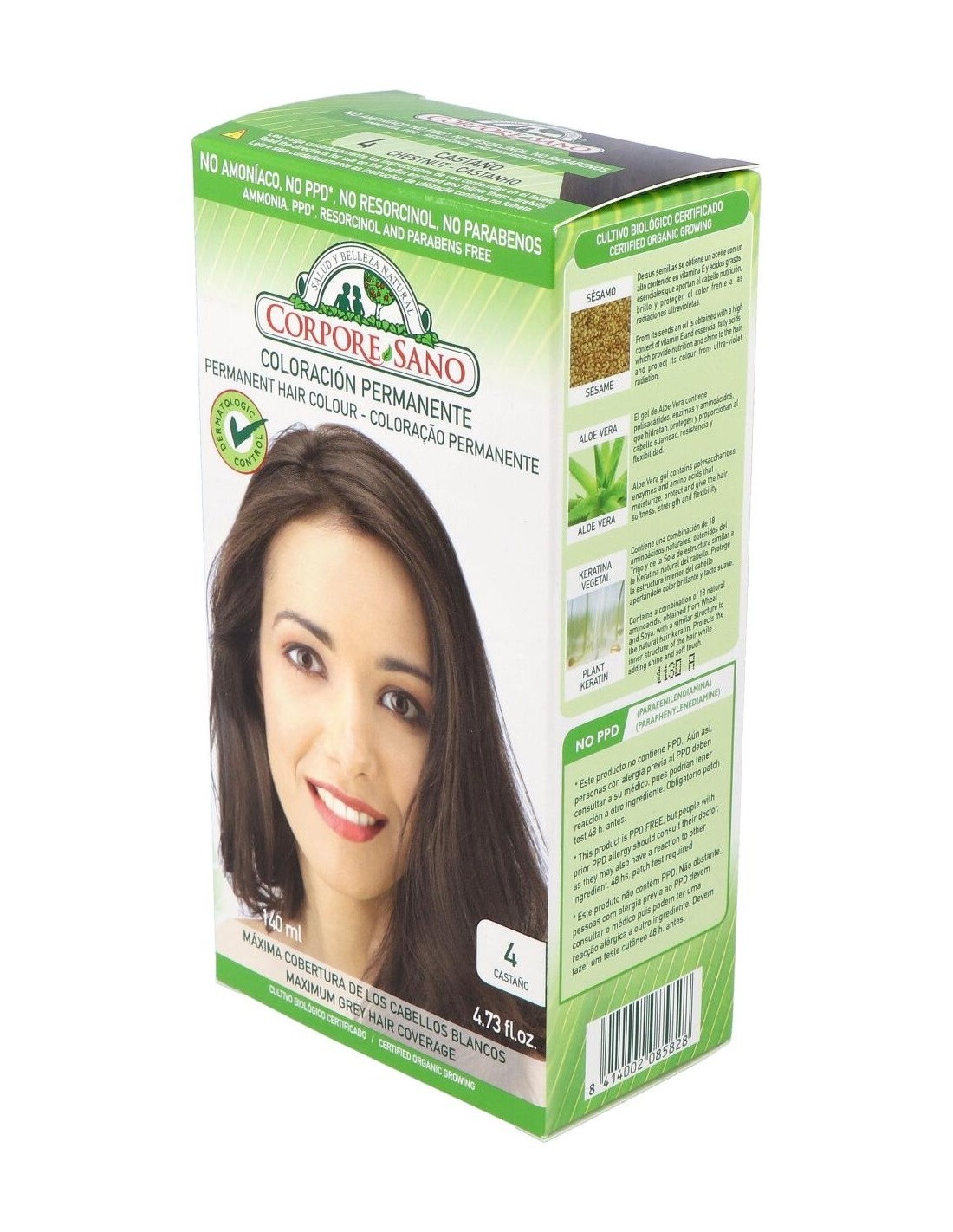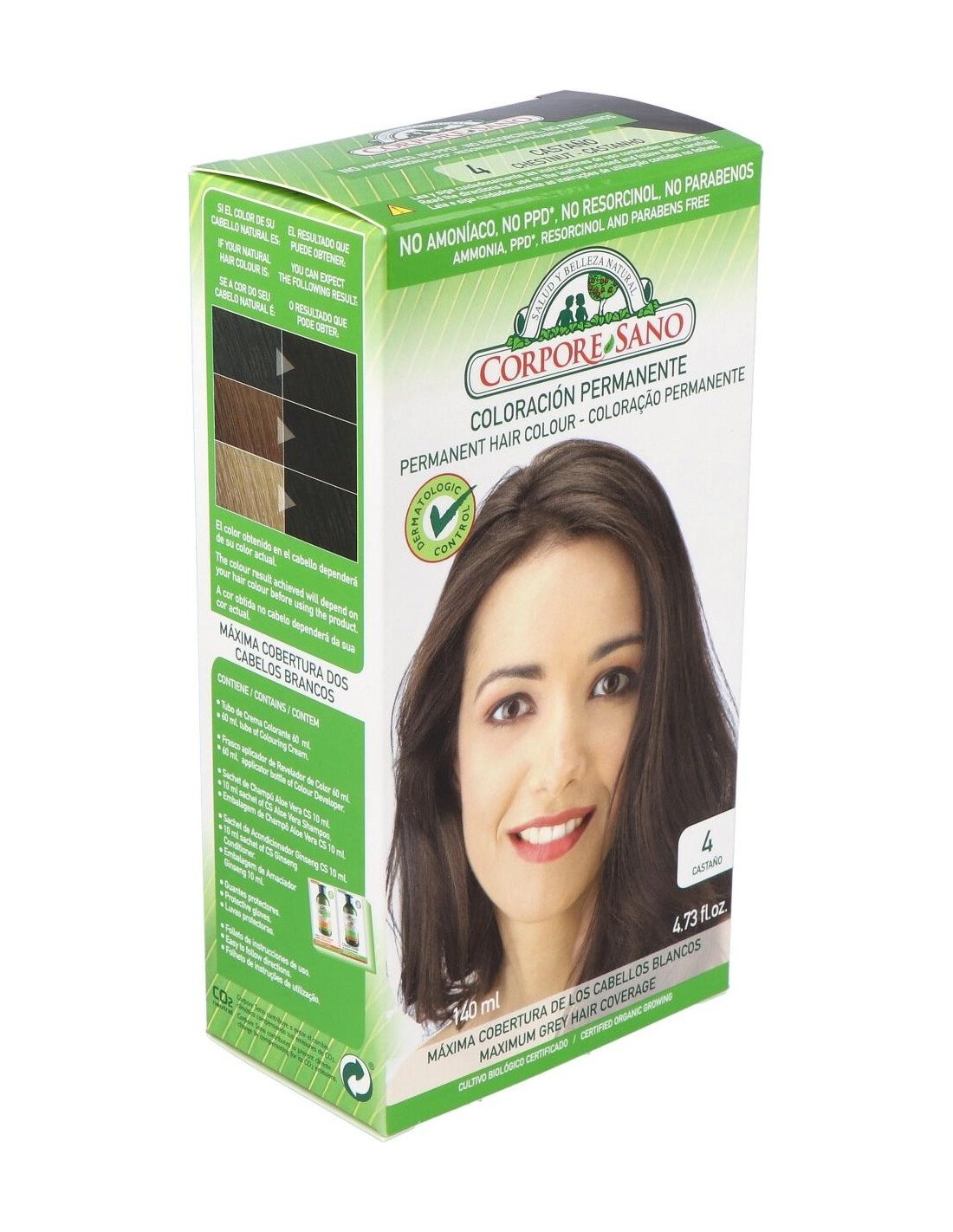 CORPORE SANOEl Tinte Castaño (4) 140Ml. de Corpore Sano es un tinte capilar para personas que buscan cobertura uniforme. Proporciona coloración natural gracias a su fórmula equilibrada y fácil aplicación.