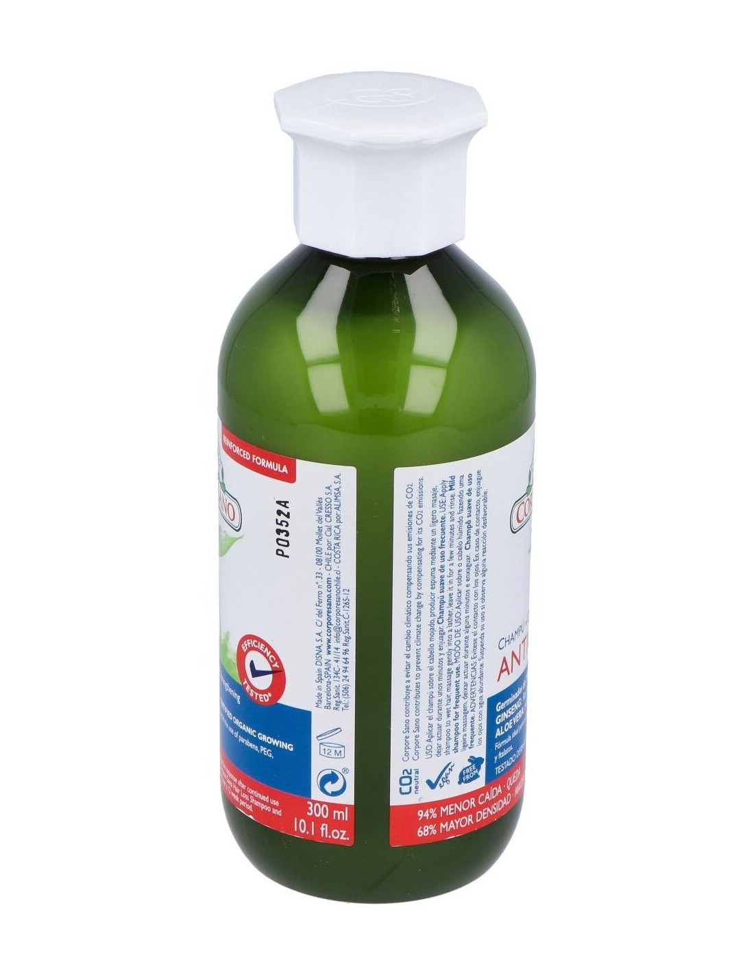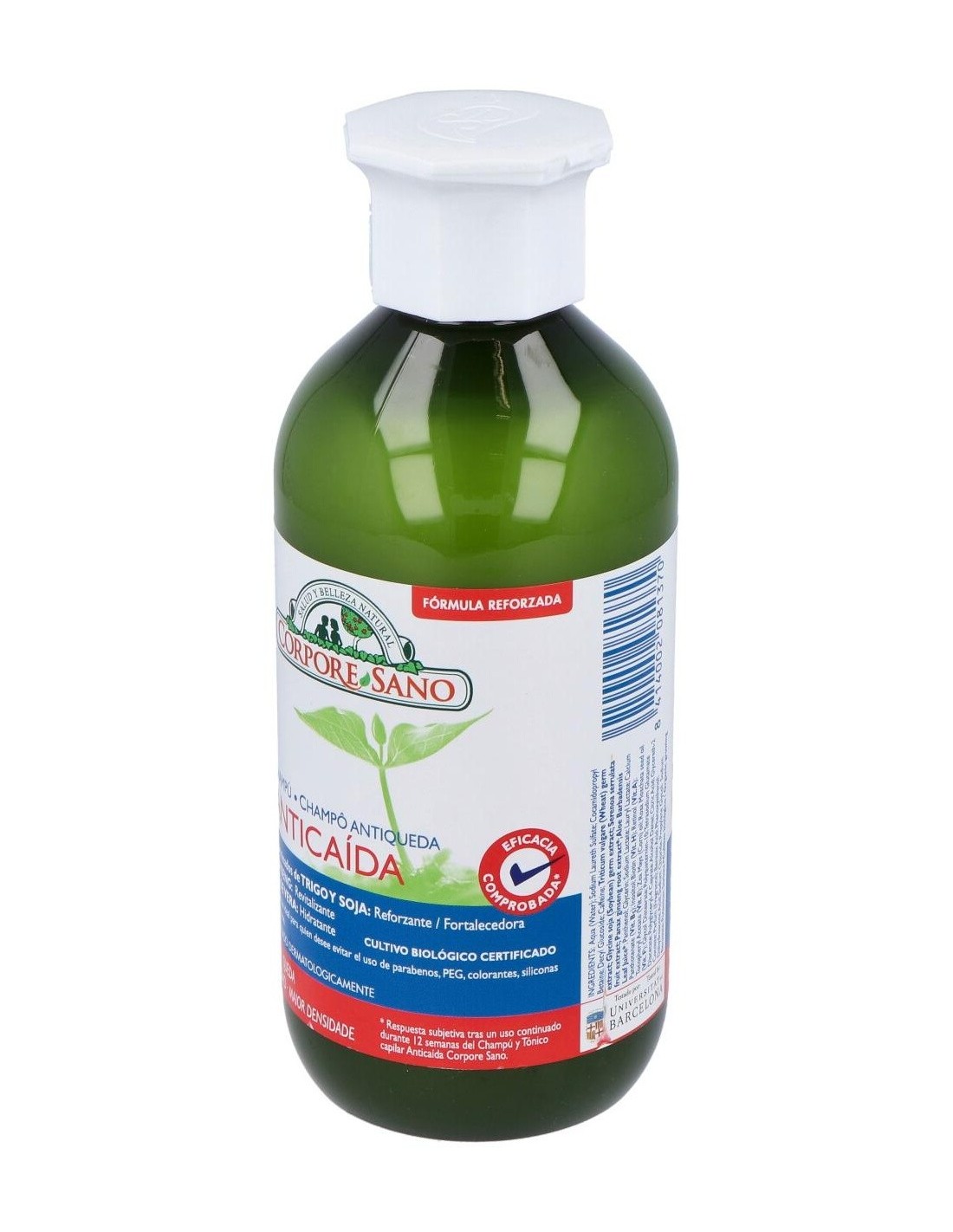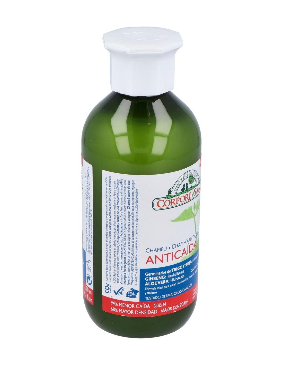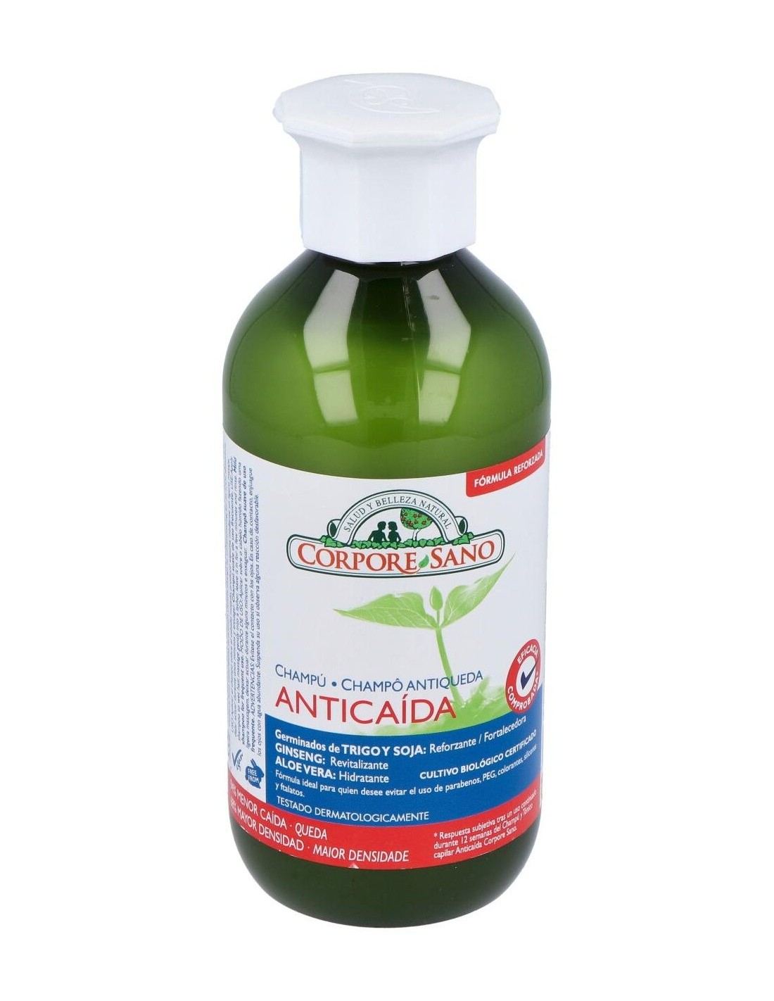 El Champú Anticaída de Corpore Sano está indicado para revitalizar el cabello y estimular su crecimiento. Contribuye a reducir la caída de cabellos.Formulado con extracto de Aloe Vera y Pro-Vitamina B5 para hidratar el cabello y protegerlo de las agresiones externas. Contiene un complejo fitoactivo obtenido de las semillas de Trigo y Soja y extracto de Ginseng, que proporciona al bulbo piloso la energía y nutrientes para fortalecer el crecimiento del cabello. Champú con ingredientes naturales y extractos BIO certificados, tiene una base lavante suave con tensoactivos de origen vegetal a la que no se le añaden colorantes, siliconas, parabenos ni PEGs.Este champú ha sido sometido a un test de eficacia. Realizado por los Laboratorios CTC Barcelona, certifica que tras un uso continuado de 6 meses del Champú y Tónico Anticaída de Corpore Sano, el 82% de los participantes presentaba resistencia a la caída y un 34% más de cabellos en fase de crecimiento.Beneficios: