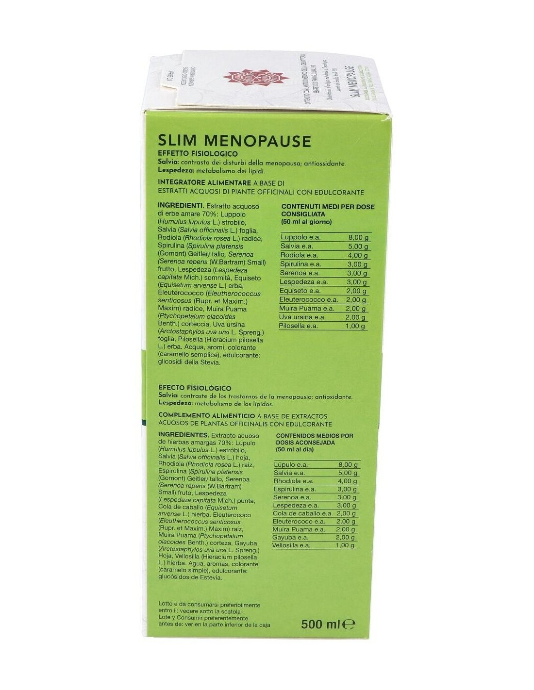 Ingredientes:Extracto acuoso de hierbas amargas 70%: Lúpulo (Humulus lupulus L.) estróbilo, Salvia (Salvia officinalis L.) hoja, Rhodiola (Rhodiola rosea L.) raíz, Espirulina (Spirulina platensis) tallo, Serenoa (Serenoa serrulata Hook F.) fruto, Lespedeza (Lespedeza capitata Mich.) punta, Cola de caballo (Equisetum arvense L.) hierba, Eleuterococo (Eleutherococcus senticosus Maxim.) raíz, Muira Puama (Ptychopetalum olacoides Benth.) corteza, Gayuba (Arctostaphylos uva ursi L. Spreng.) hoja, Velosilla (Hieracium pilosella L.) hierba. Agua, aromas, colorante (caramelo natural), edulcorante: glicósidos de Estevia. Modo de empleo:Tomar 5 medidas (1 medida = 10 ml) diluidas en una botella de agua de 1,5 ml, para consumir durante el día. Presentación:Botella de 500 ml.