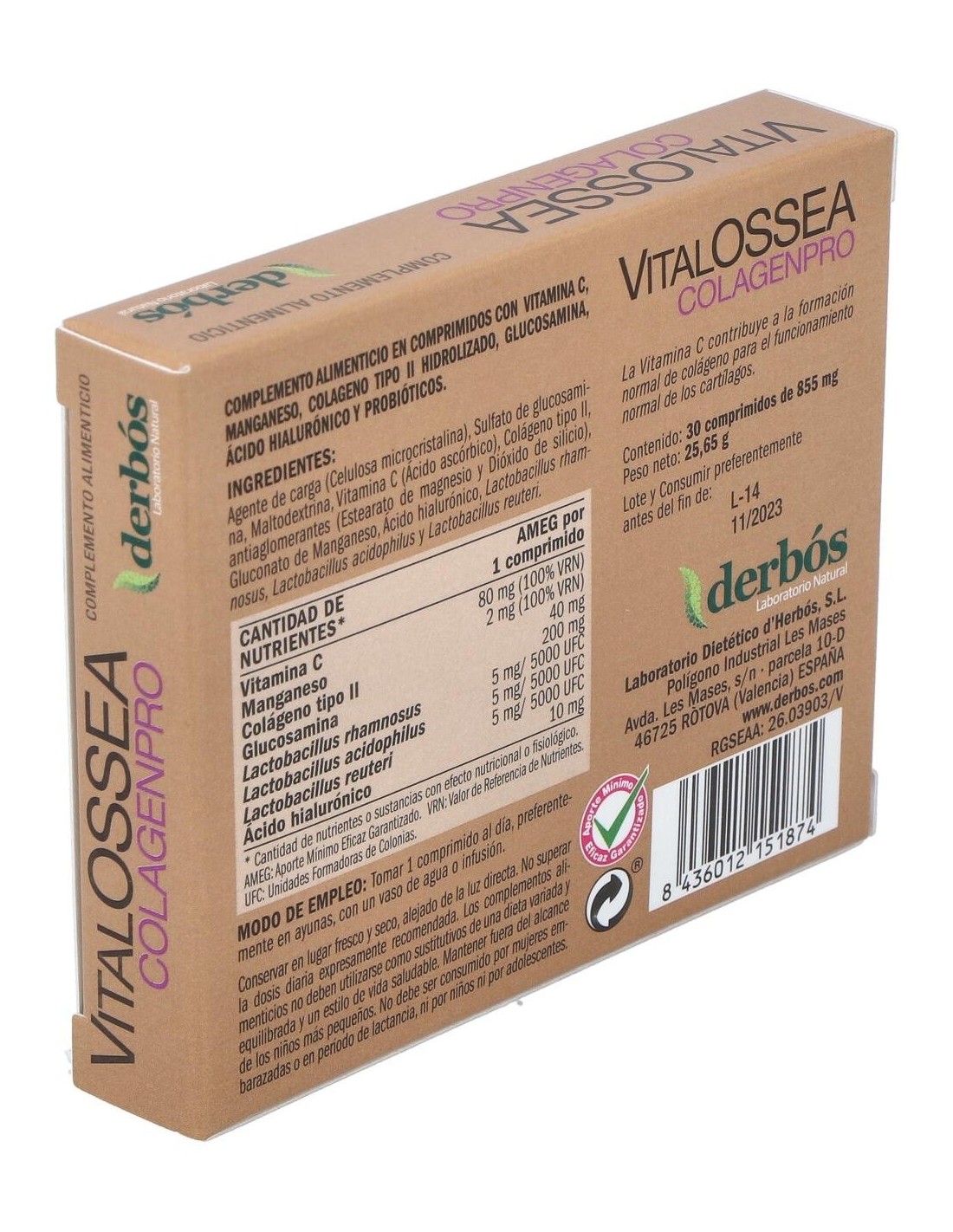 DERBOSComplemento alimenticio en comprimidos con vitamina C, manganeso, colágeno tipo II, glucosamina, ácido hialurónico y probióticos. La vitamina C contribuye a la formación normal de colágeno para aelfuncionamiento normal de los cartílagos.