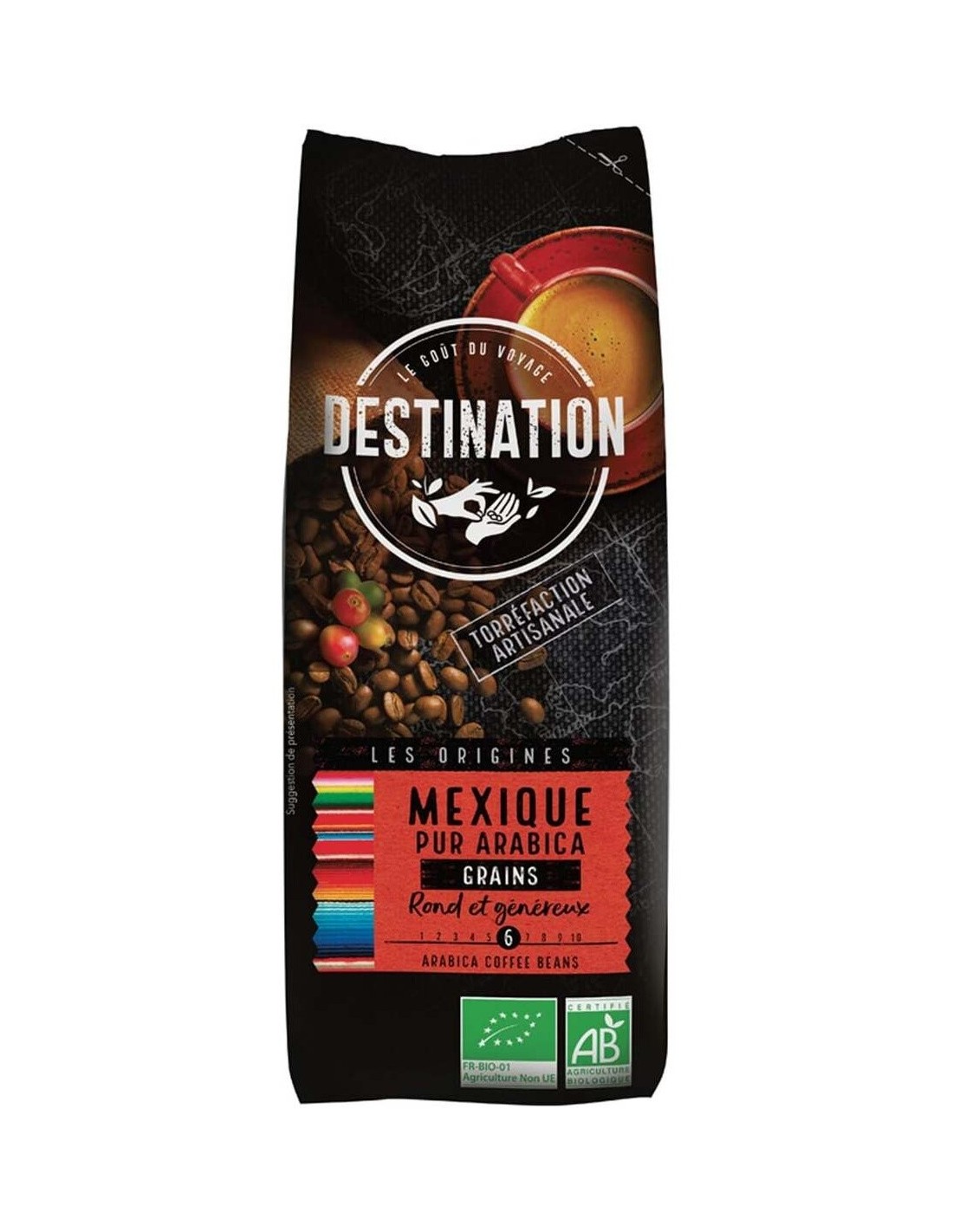 DESTINATIONCafé orgánico generoso en boca, con aromas delicados y cremosos. Naturalmente bajo en cafeína (aproximadamente 1,22%).