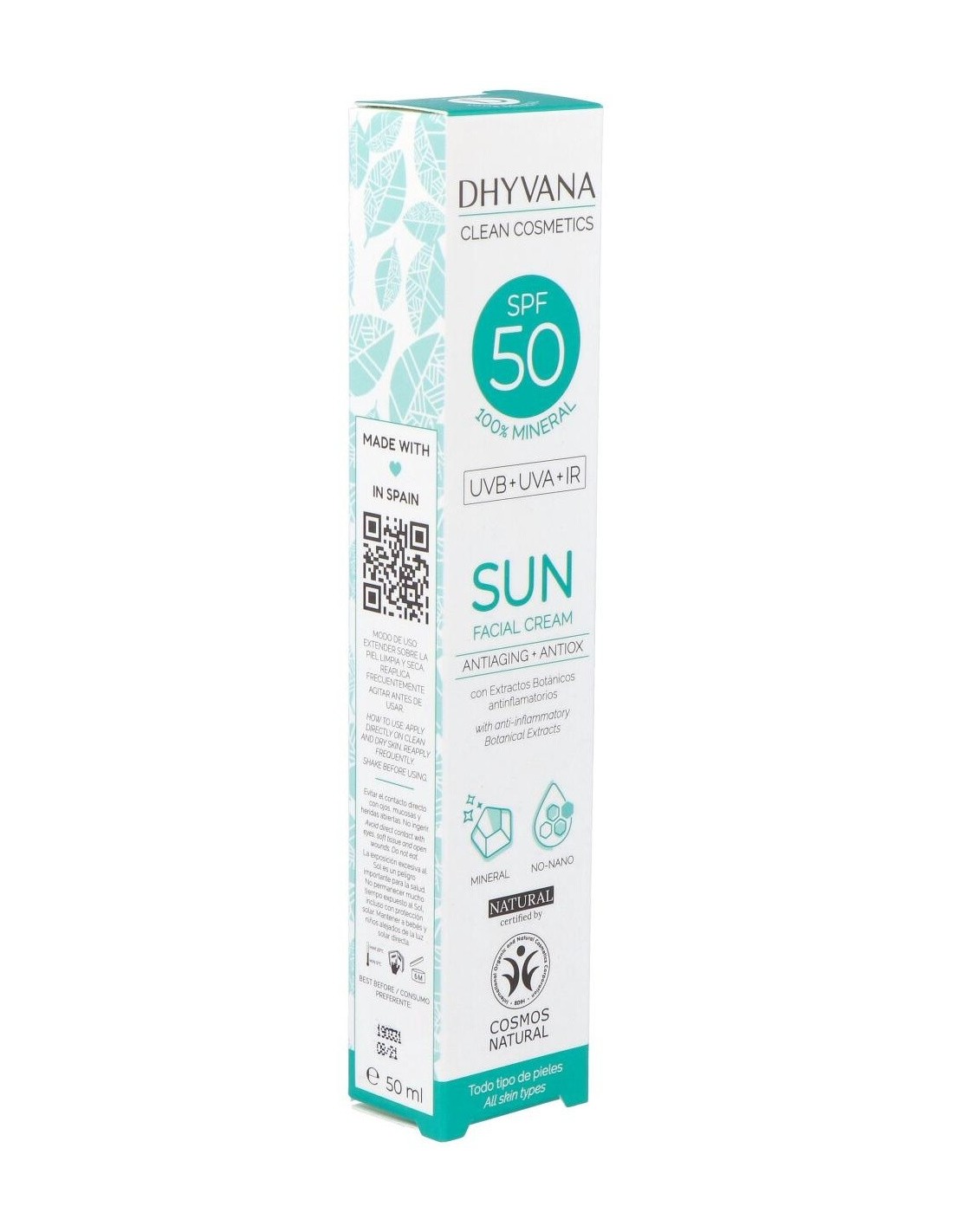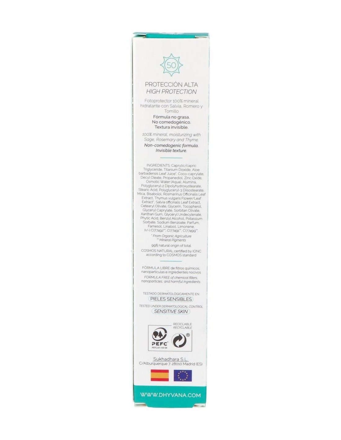 Eco Suncare® Protector Solar Spf50 de Dhyvana es un filtro solar físico que proporciona una fotoprotección de amplio espectro frente a las radiaciones UVA y UVB para todos los fototipos. Gracias a su alto factor de protección, ayuda eficazmente a prevenir quemaduras causadas por el sol, así como la oxidación y el envejecimiento cutáneo. Su composición natural, 100% mineral y sin nanopartículas, es respetuosa con el medio ambiente y puede utilizarse en ecosistemas acuáticos protegidos.
