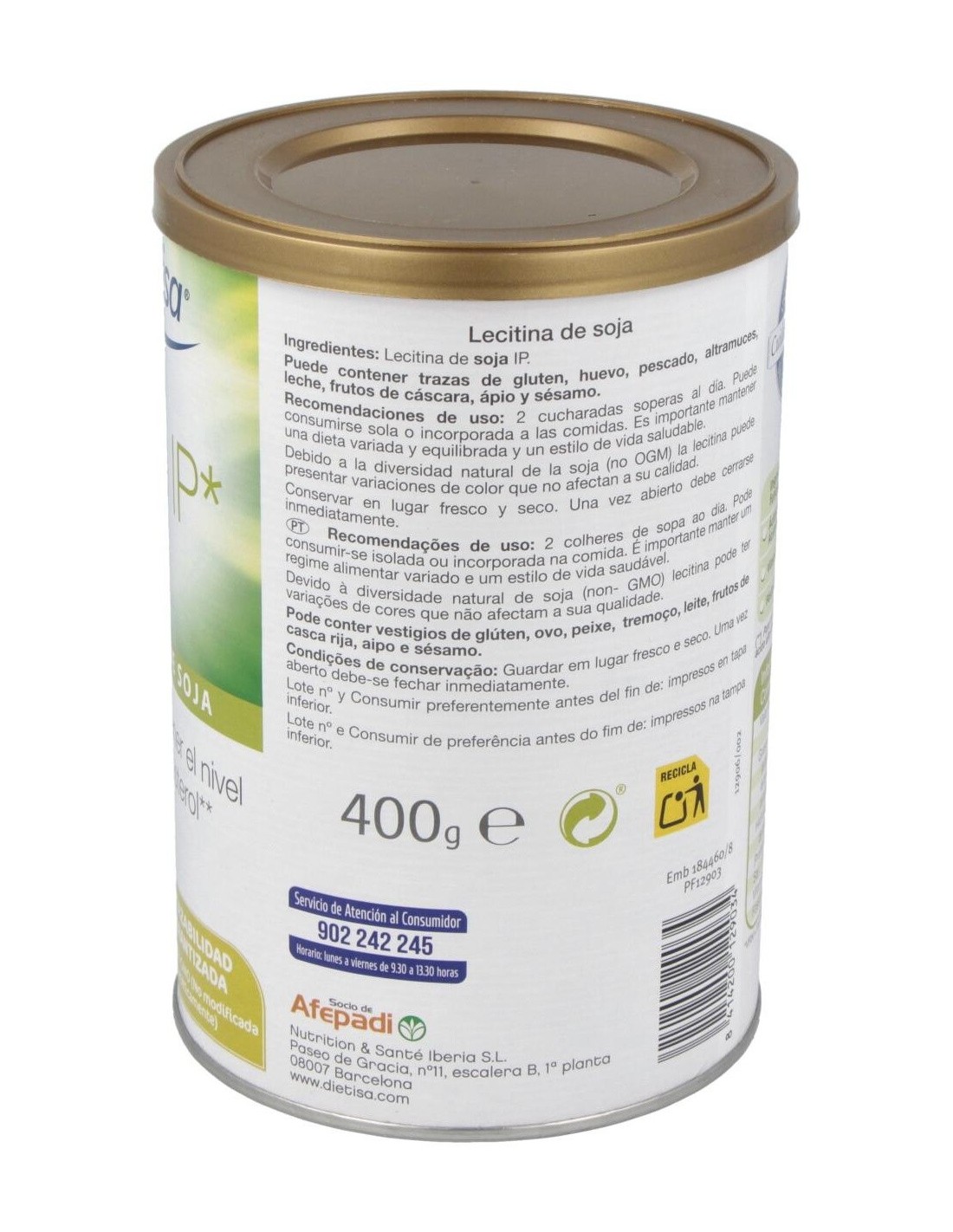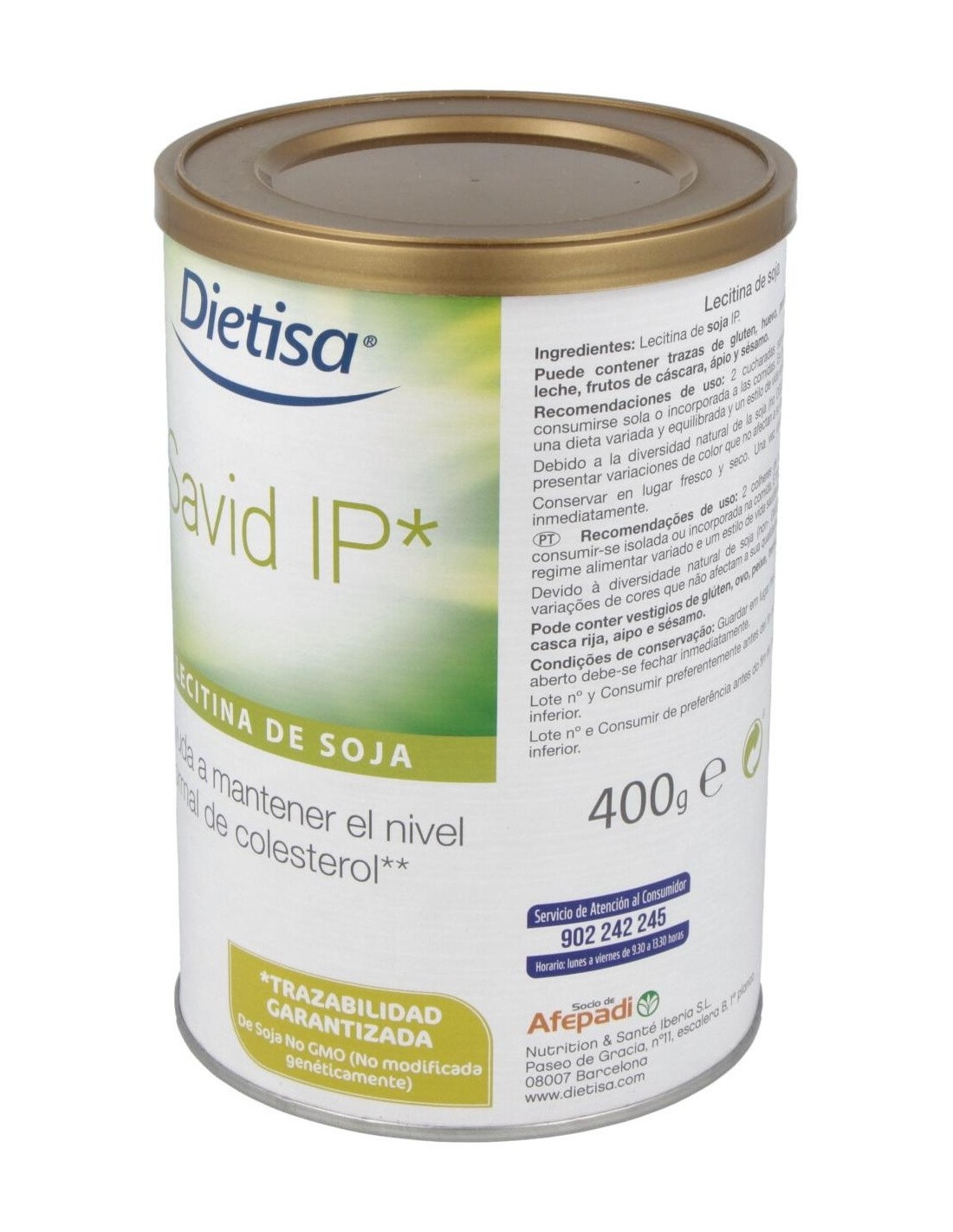 DIELISA®Dietisa Savid Ip Lecitina De Soja 400g es un complemento alimenticio a base de lecitina de soja que contribuye a mantener niveles normales de colesterol. Savid IP (Identidad preservada) es una mezcla natural de fosfolípidos que ofrece la máxima calidad y homogeneidad, además de trazabilidad garantizada, pues este producto asegura que no contiene organismos modificados genéticamente (OMG/GMO) de ningún tipo y en todos los procesos, desde el cultivo y las semillas hasta la completa e.