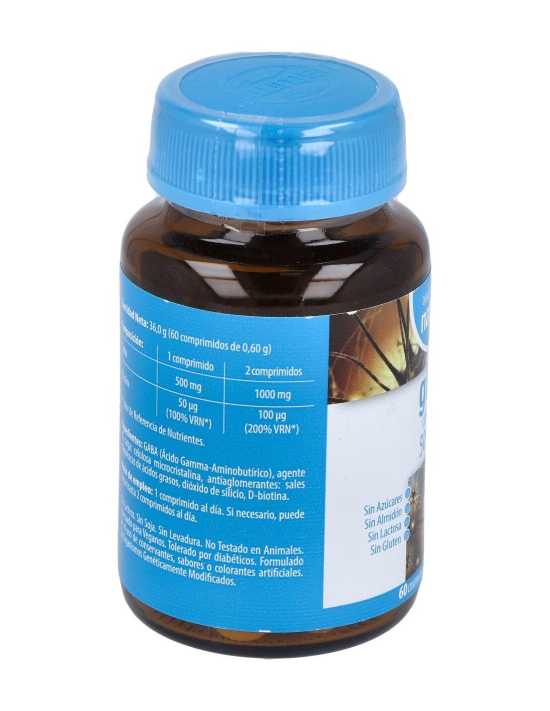 Ingredientes:GABA (Ácido Gama-Aminobutírico); Agente de carga: celulosa microcristalina; antiaglomerantes: sales magnésicas de ácidos grasos, dióxido de silicio; D-biotina.Modo de empleo:Tomar 1 cápsula al día. Si es necesario puede tomar hasta 2 cápsulas al día.Presentación:Envase de 60 cápsulas.Recomendaciones y advertencias:No contiene azúcares, almidón, lactosa ni gluten.