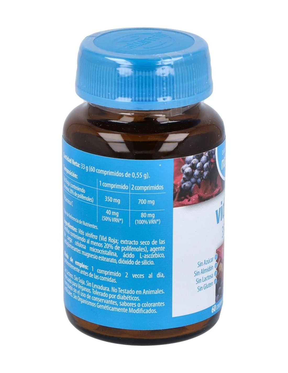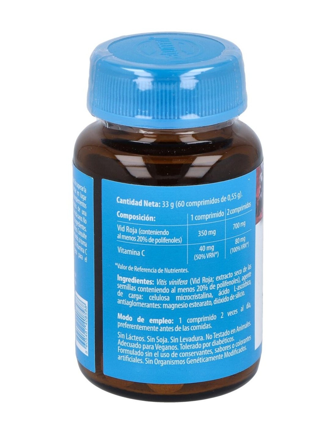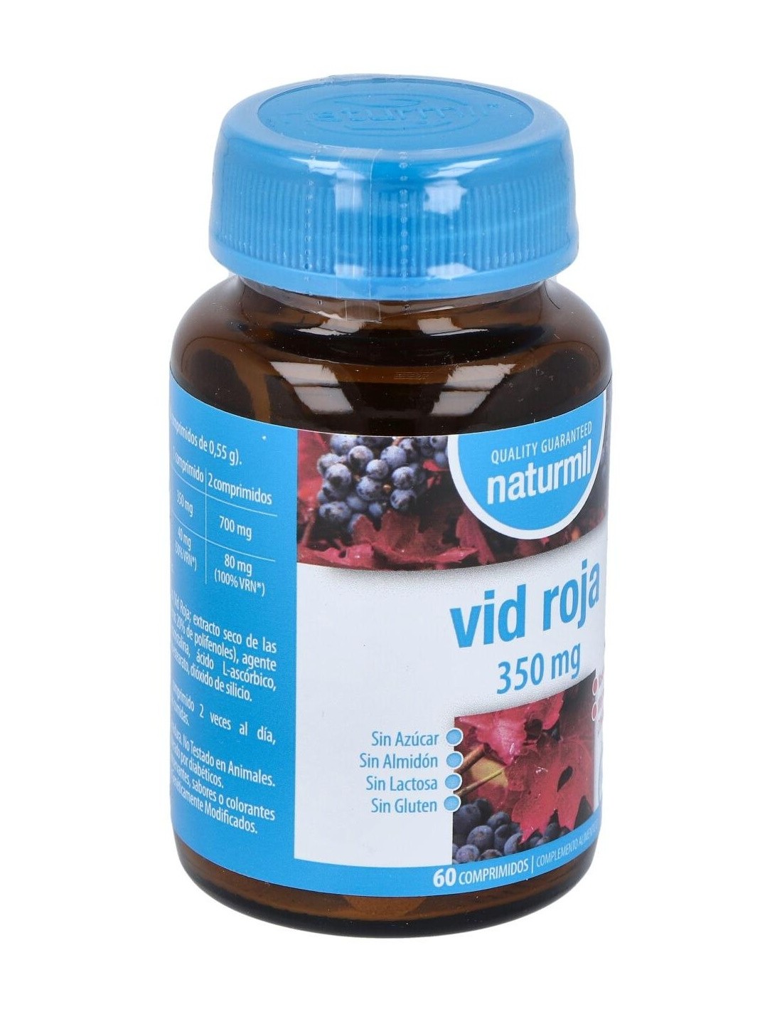 - Cada comprimido contiene 350 mg de extracto de vid roja, reconocido por su composición natural.