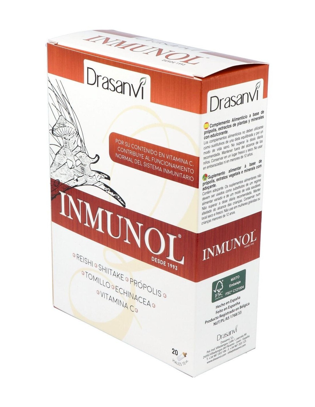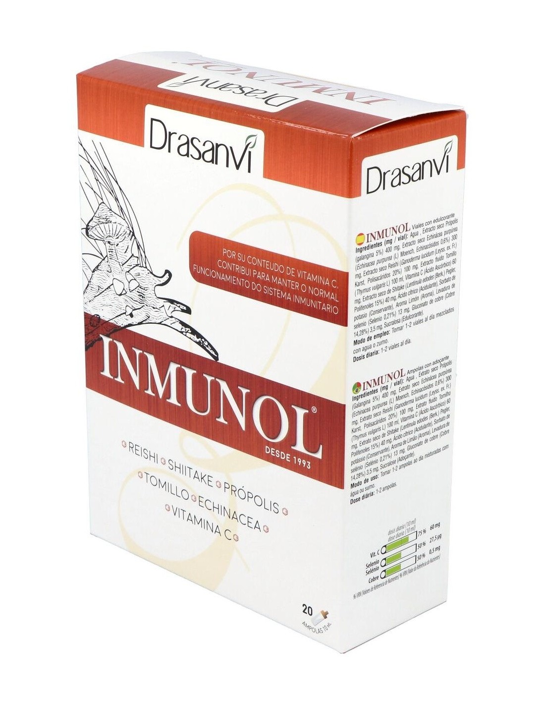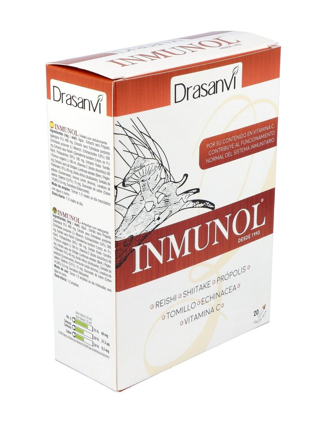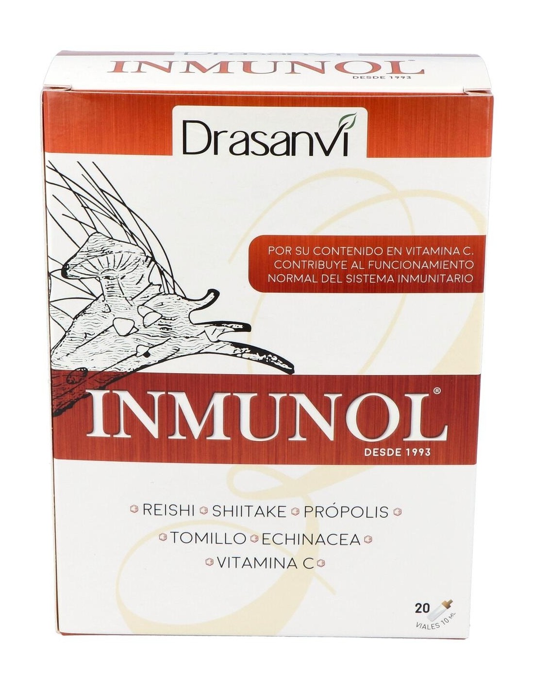 Inmunol es un complemento alimenticio formulado con hongos de utilización milenaria llamados reishi y shiitake; minerales como el cobre y el selenio; tomillo, equinácea, própolis; y vitamina C, que contribuye al mantenimiento del sistema inmunitario en condiciones normales.Composición por vial: